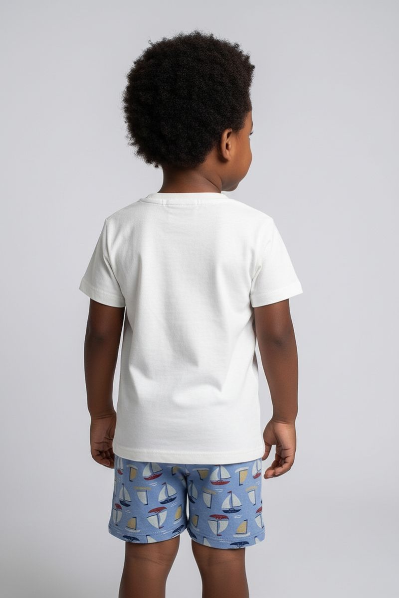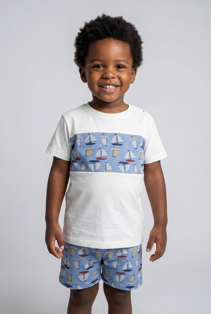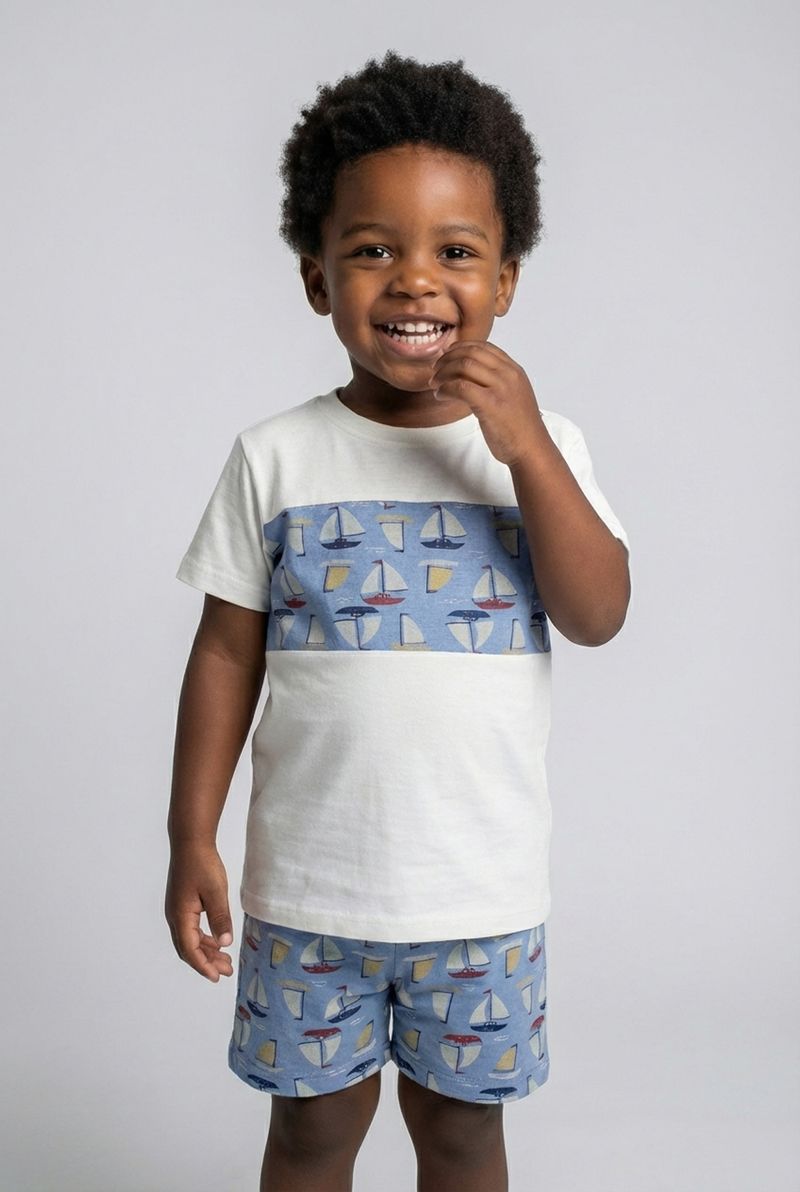 O Conjunto Infantil Náutico Barquinhos Caedu oferece estilo e conforto para os pequenos exploradores. Com blusa de recorte e short estampado, este conjunto é perfeito para aventuras, garantindo liberdade e um visual encantador. Uma roupa infantil cheia de charme para o dia a dia.