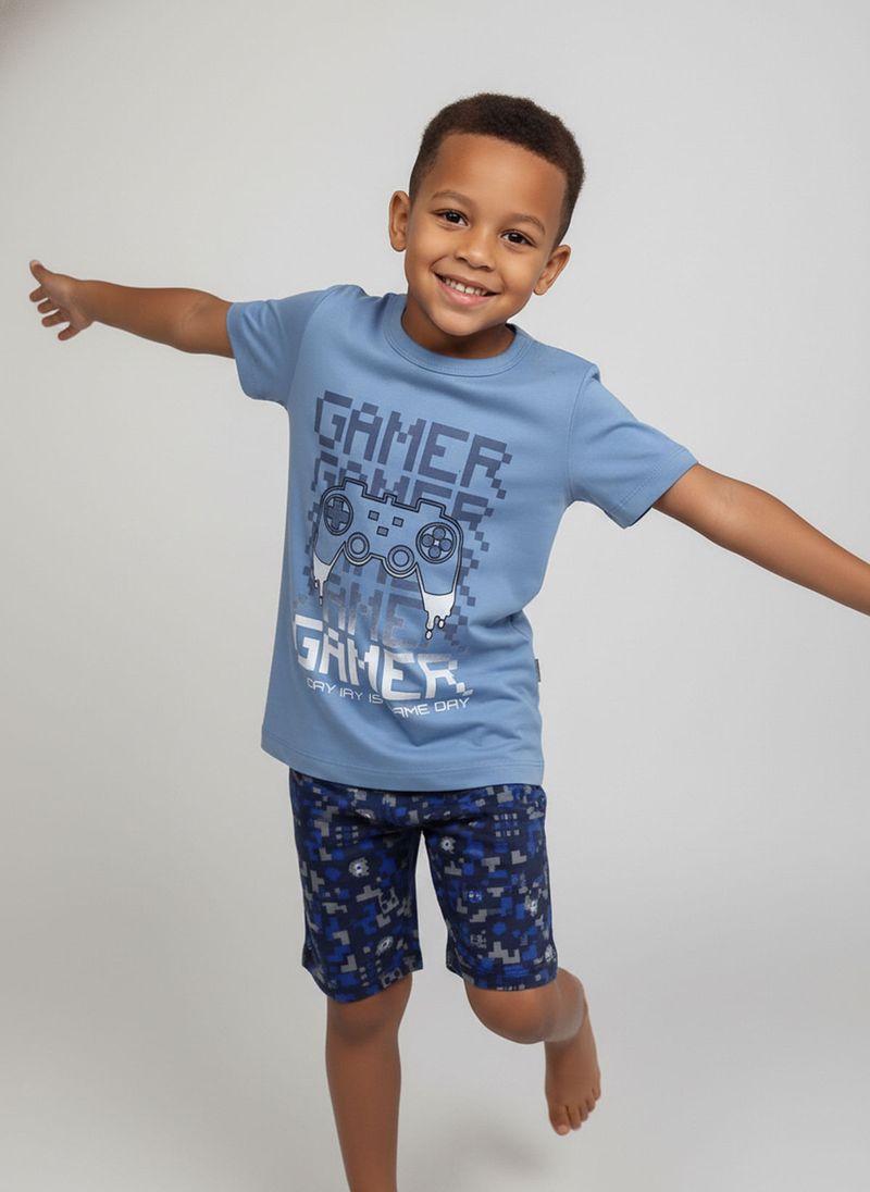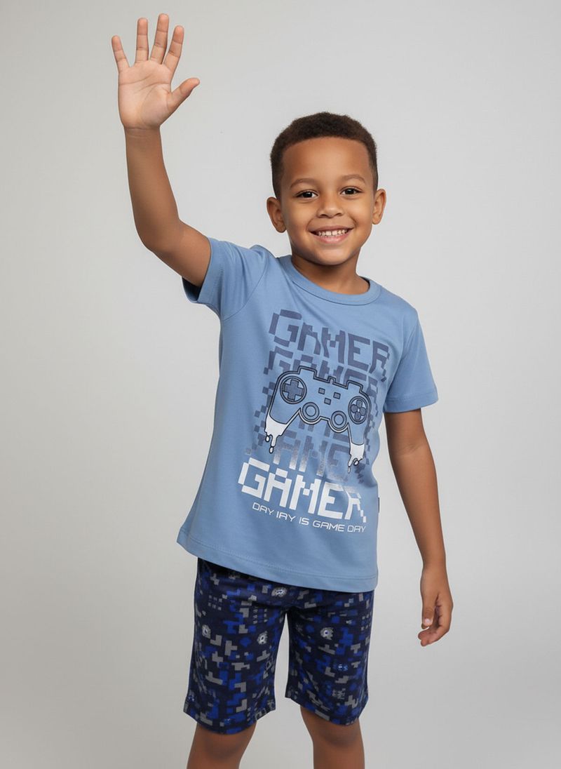 O Conjunto Infantil Gamer da marca Infantil é ideal para os pequenos. Com camiseta azul claro 100% algodão e estampa de controle pixelado, e bermuda camuflada, oferece conforto e estilo. Esta roupa infantil é perfeita para o dia a dia, garantindo diversão e liberdade.