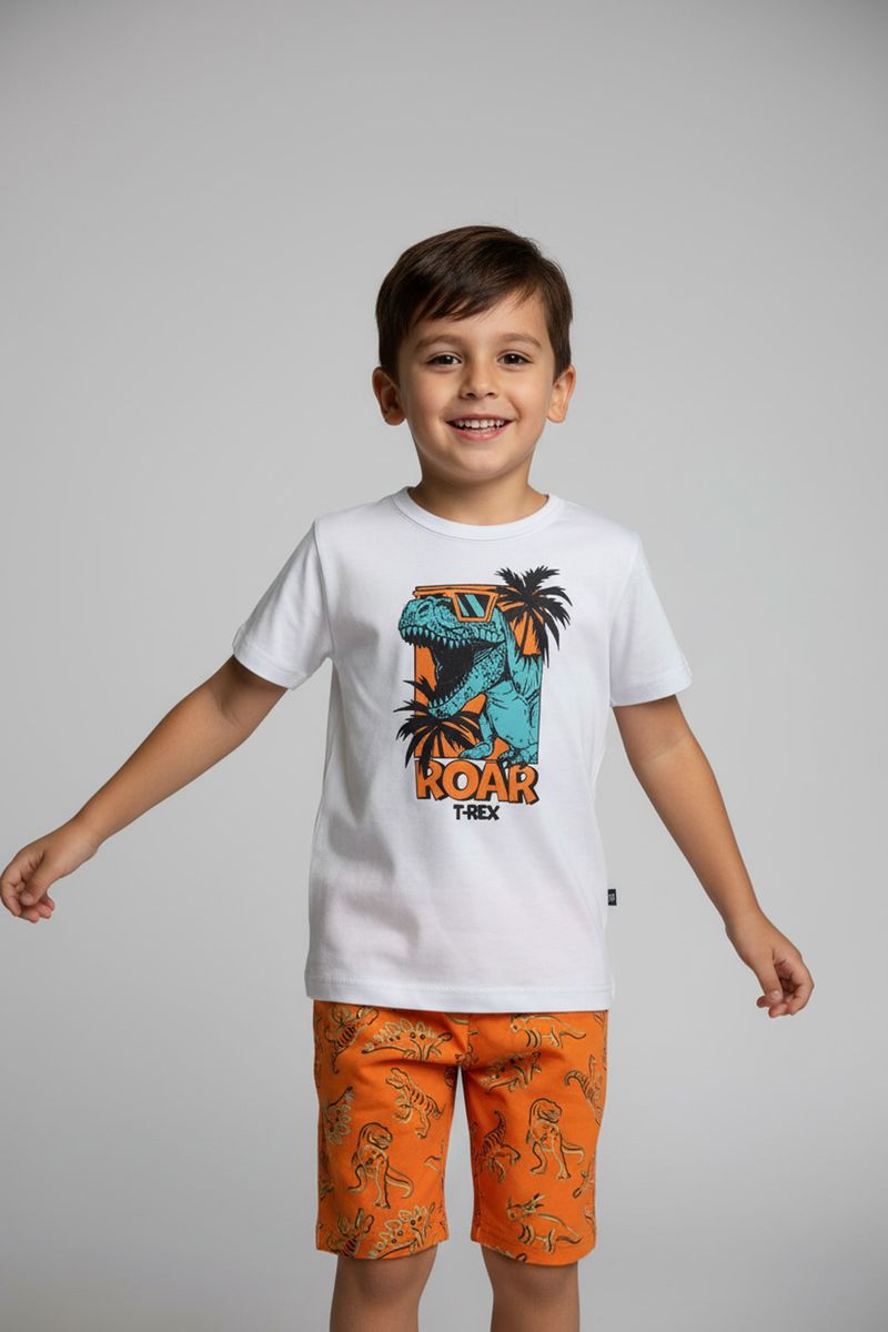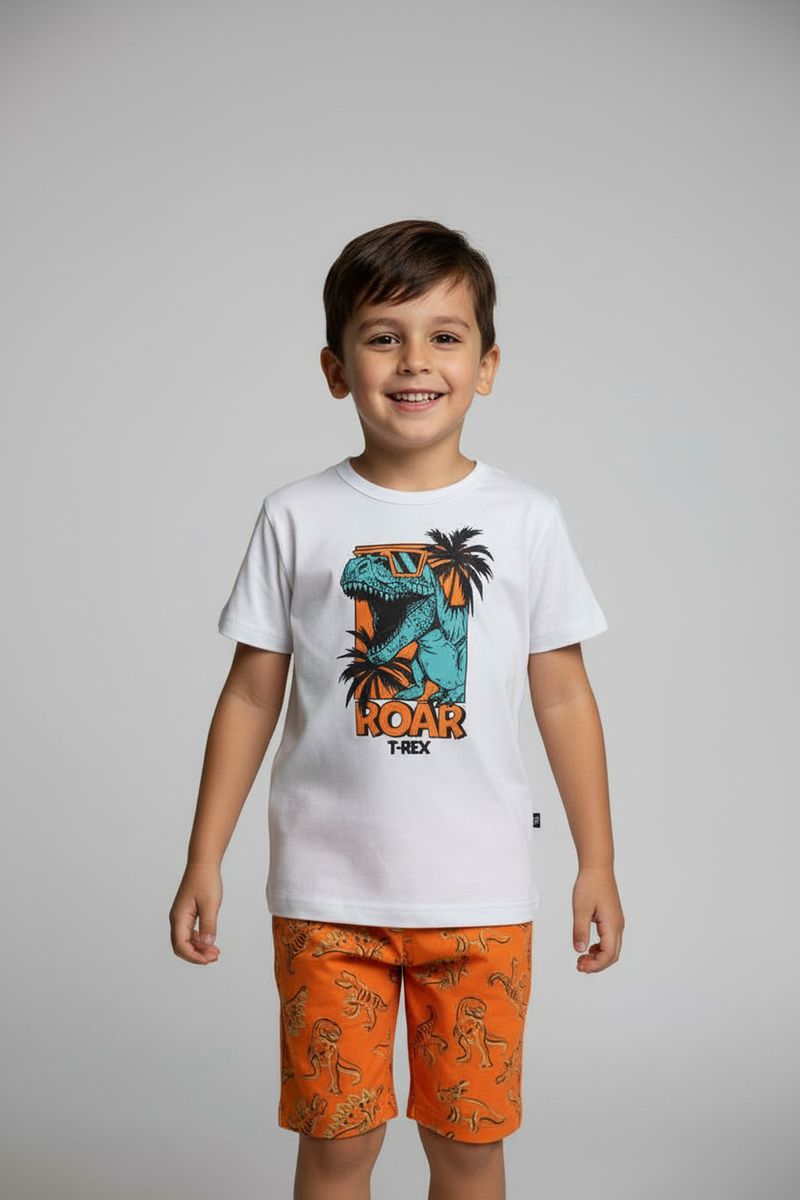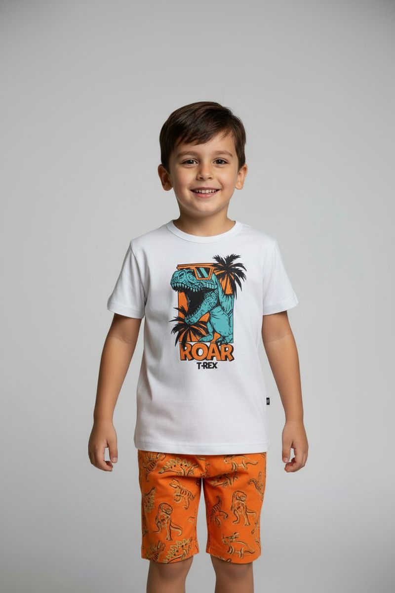 O Conjunto Infantil Menino Caedu T-Rex ROAR oferece conforto e estilo para as aventuras do seu pequeno. Com camiseta de dinossauro em 100% algodão e bermuda laranja vibrante, é a roupa infantil perfeita para brincadeiras, garantindo bom preço e moda infantil de qualidade.
