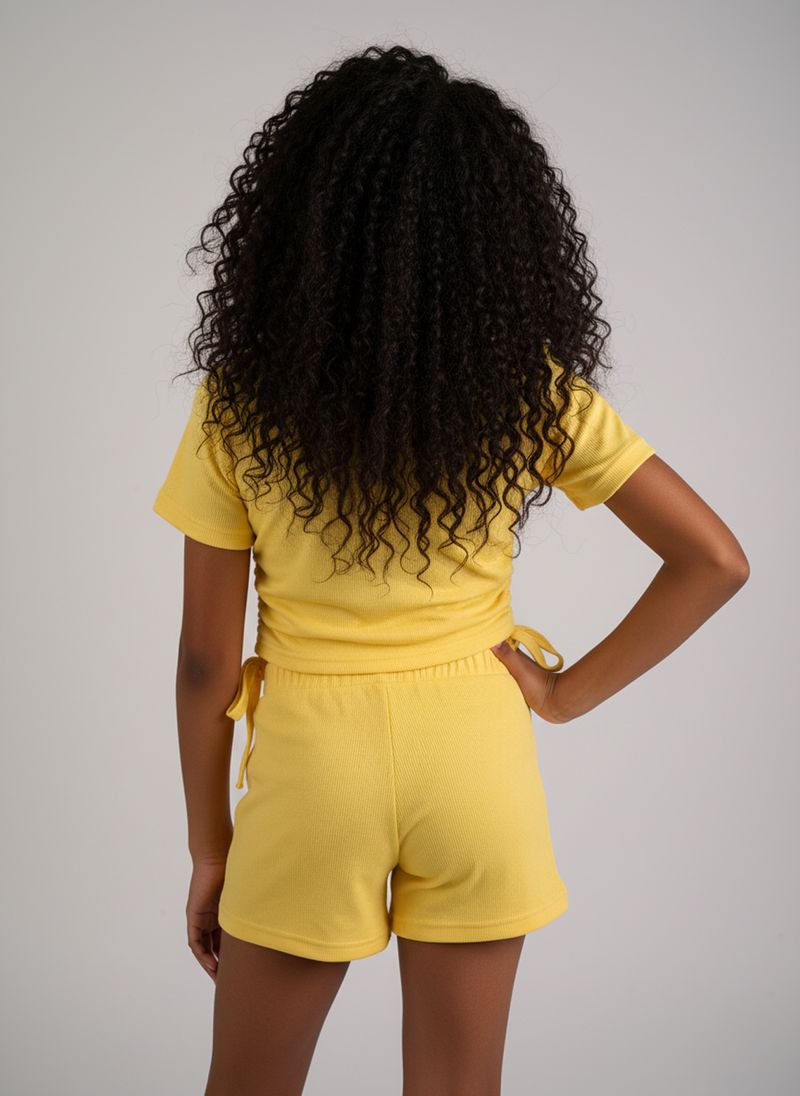 Combine o conjunto amarelo com tênis brancos para um look casual e divertido. Para um toque mais despojado, adicione uma jaqueta jeans clara ou um colete. Sandálias coloridas ou sapatilhas completam o visual com charme. Acessórios como bonés e mochilas pequenas também são ótimas opções para criar looks completos e cheios de personalidade.