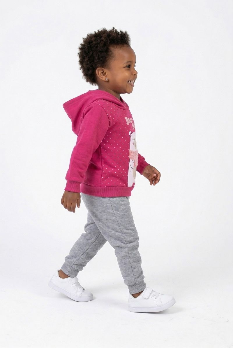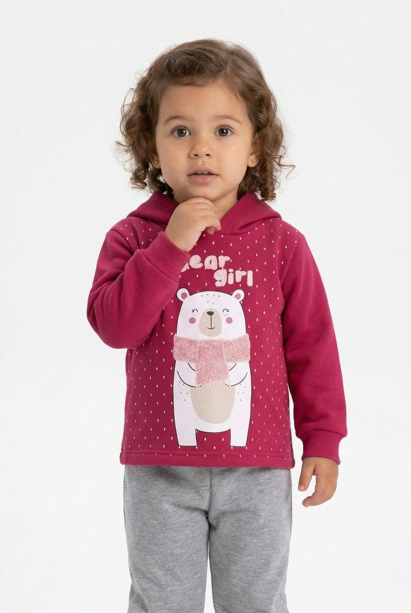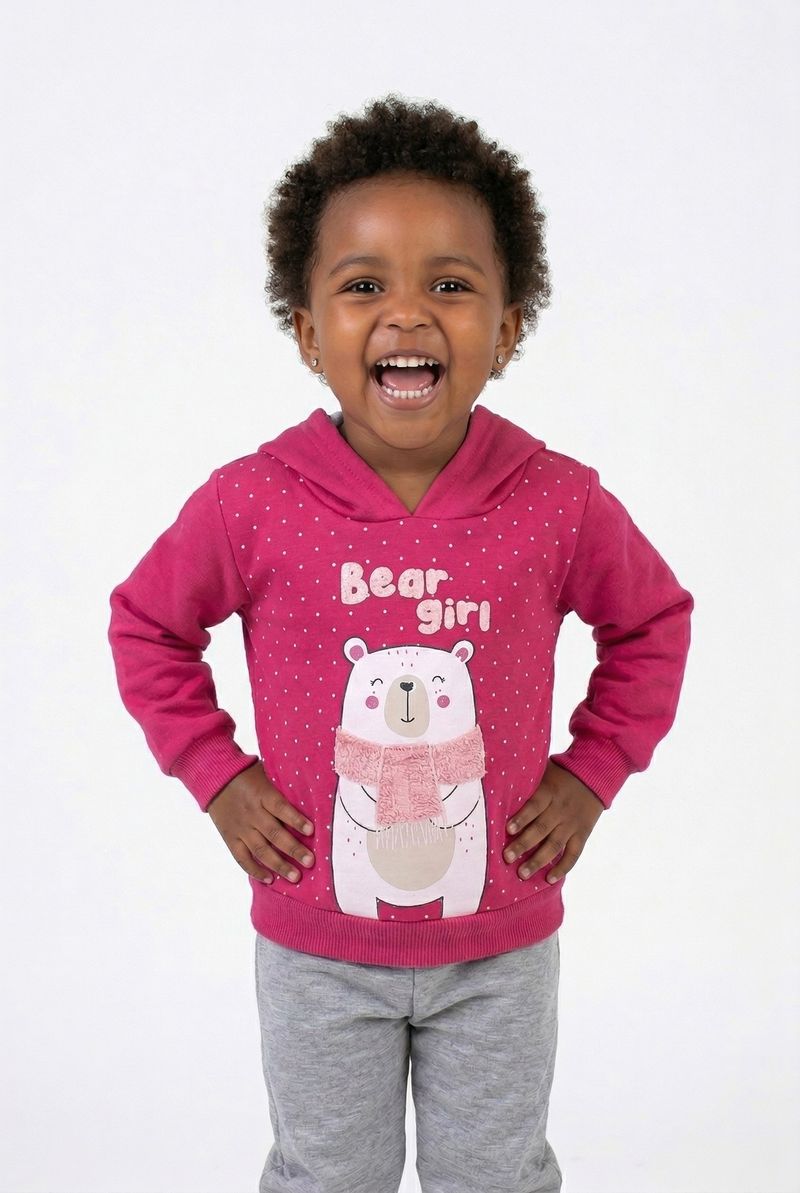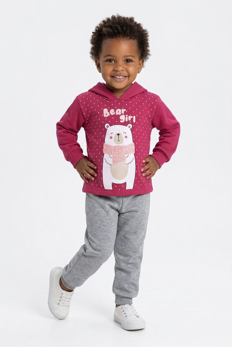 O Conjunto Infantil Caedu Bear Girl oferece conforto e estilo para as pequenas. Com blusa de capuz rosa em moletom com felpa e estampa de urso polar, e calça moletom cinza com punhos canelados, é a escolha perfeita para o dia a dia. Uma roupa infantil que une diversão e bem-estar.