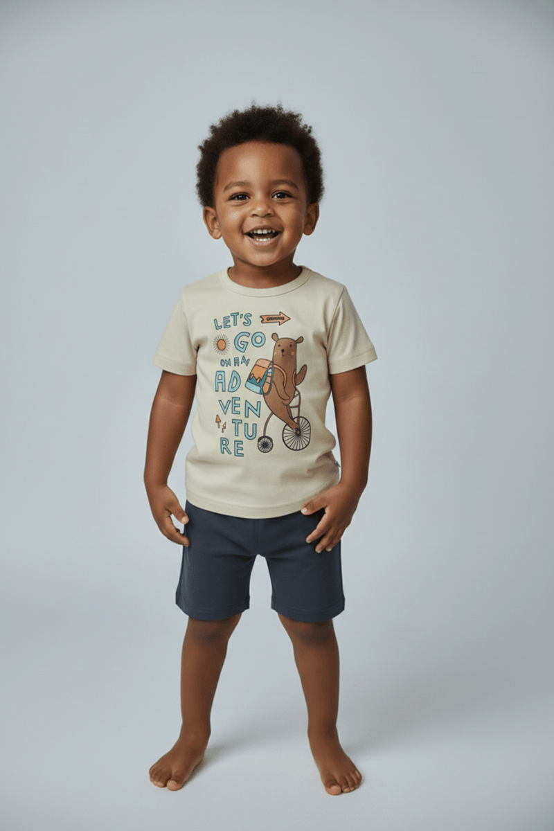 Prepare seu pequeno para a aventura com o Conjunto Infantil Caedu! A camiseta em meia malha com estampa de urso 'LET'S GO ON AN ADVENTURE' e o short grafite liso garantem conforto e estilo. Uma roupa infantil perfeita para o dia a dia, ideal para brincar com liberdade e explorar o mundo.