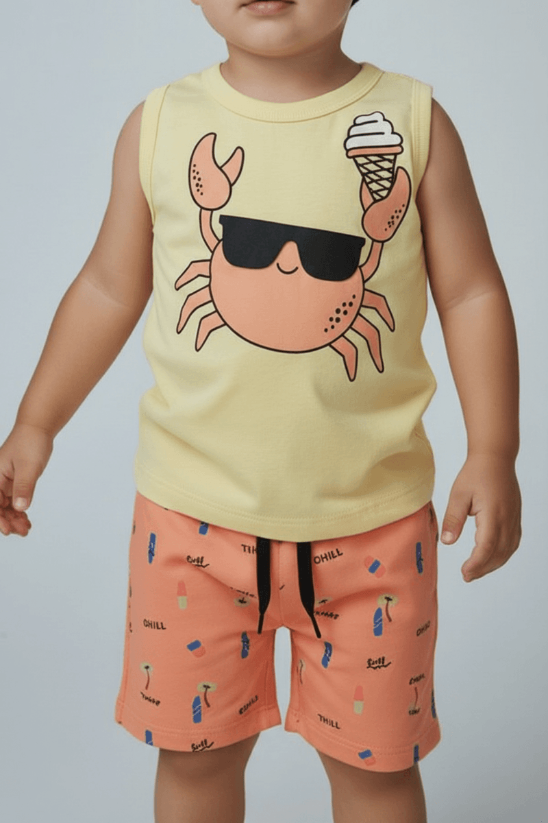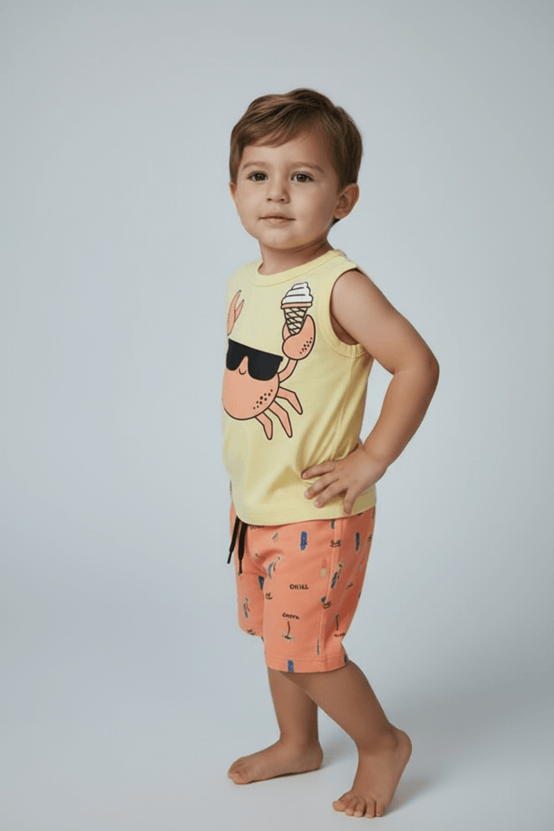 Vista seu pequeno com o Conjunto Infantil Caedu Regata Amarela Caranguejo e Shorts Laranja Estampado. Confeccionado em moletom sem felpa, oferece máximo conforto e estilo para as aventuras diárias. Uma roupa infantil vibrante e perfeita para brincar com muita diversão!