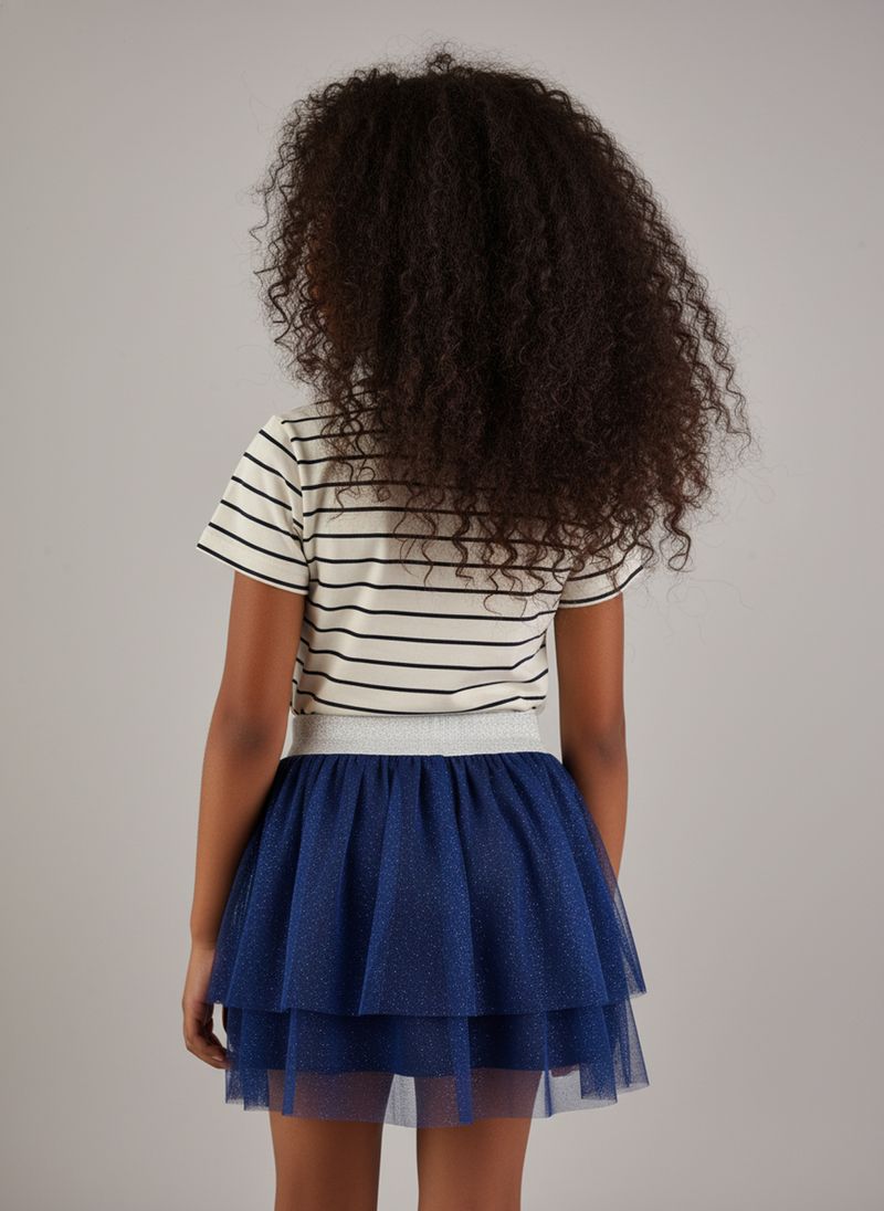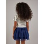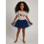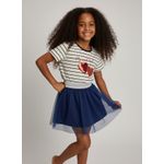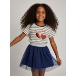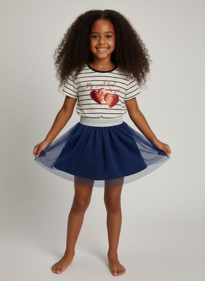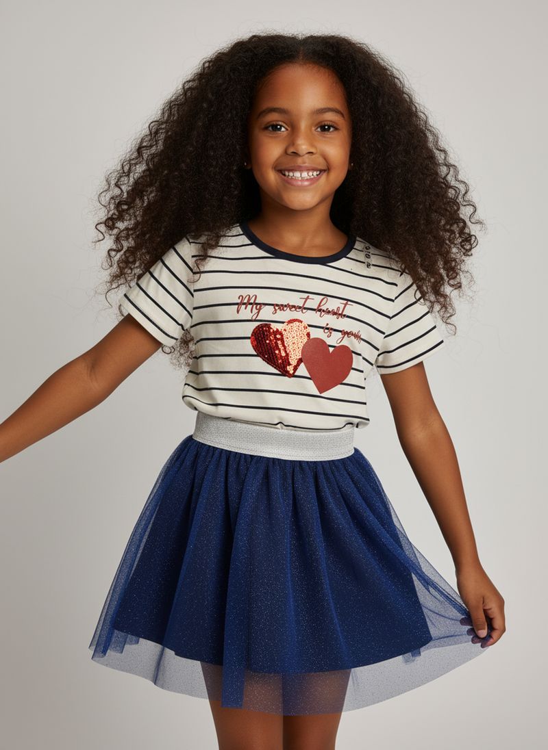 O Conjunto Menina Caedu My Sweetheart oferece um visual encantador e moderno. Com blusa listrada off-white e estampa "My sweet heart" com corações brilhantes, e uma saia de tule azul-marinho com glitter e cintura prateada, é perfeito para sua pequena brilhar com muito estilo e conforto.