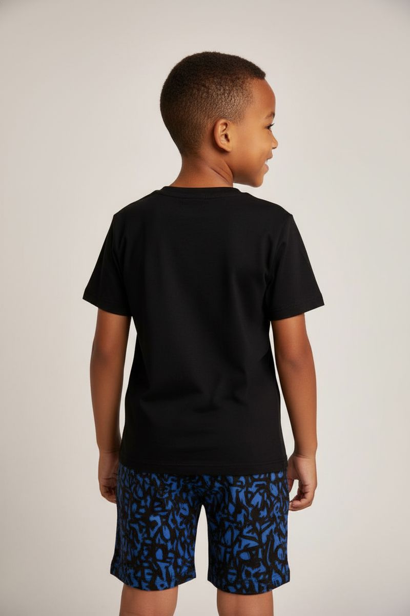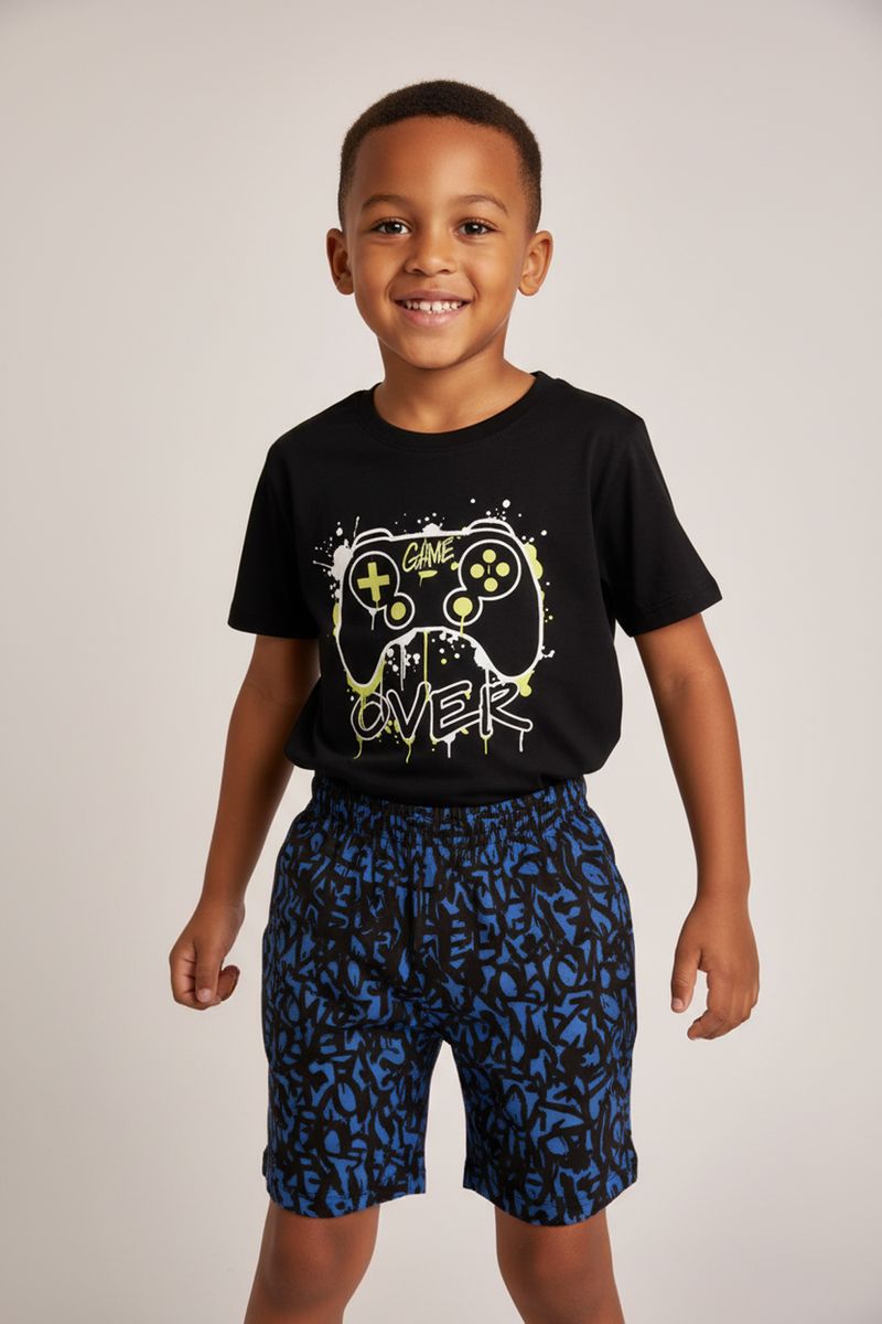 O Conjunto Gamer Infantil, em 100% algodão e meia malha, oferece conforto e estilo. Com camiseta preta de estampa de controle e shorts azul estampado, é a roupa ideal para o dia a dia dos pequenos gamers.