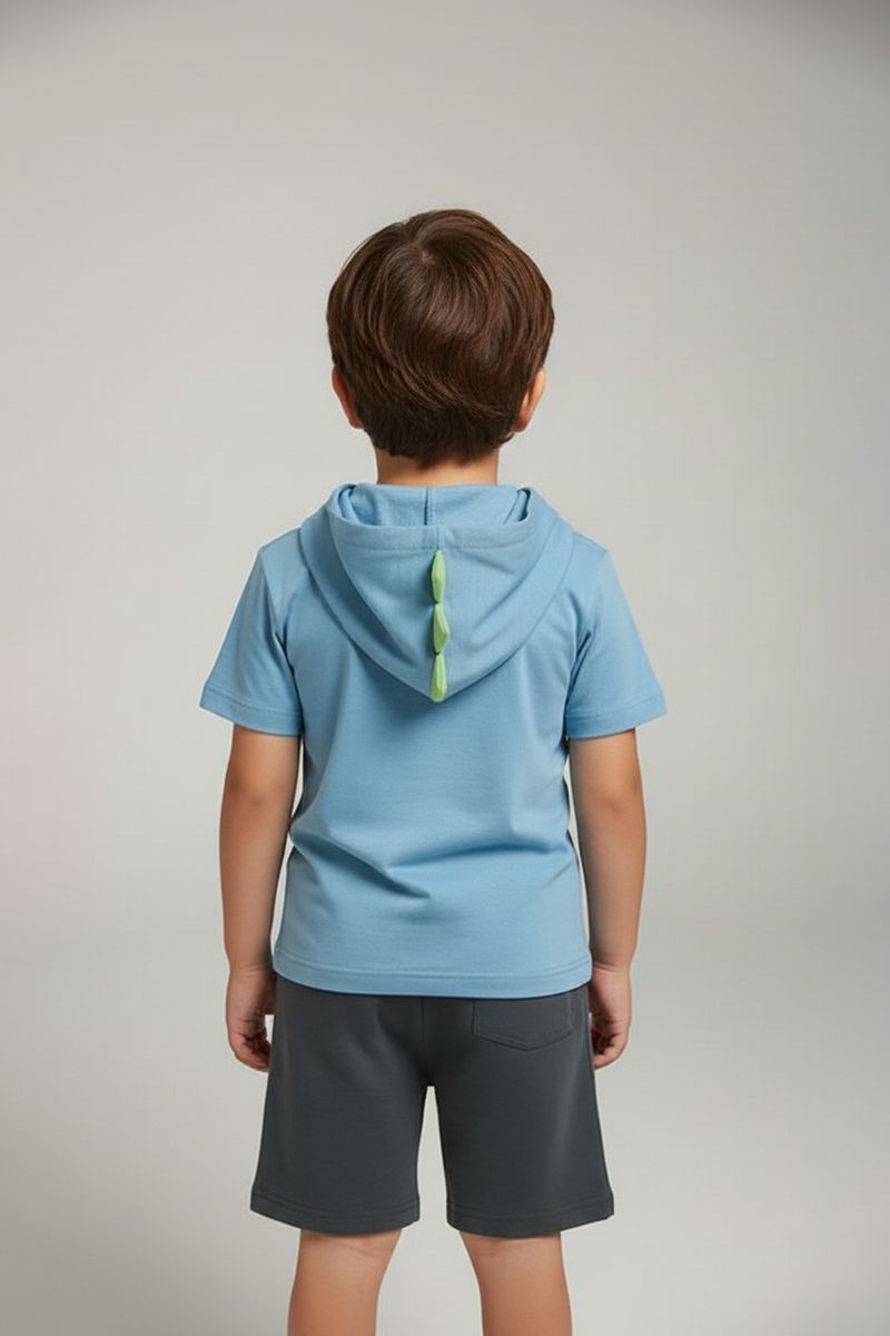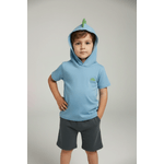 Conjunto Infantil Caedu Dino Aventura: Blusa com Capuz Azul Claro e Shorts Cinza