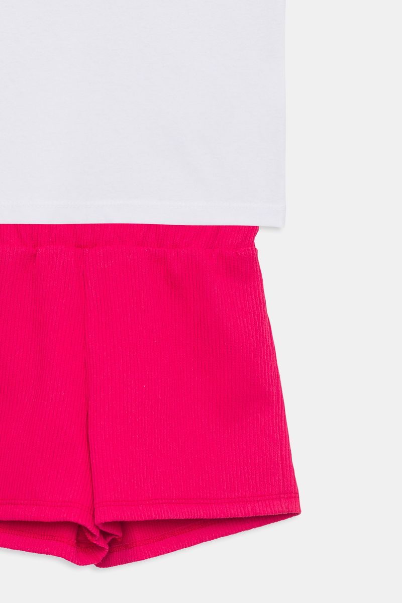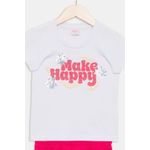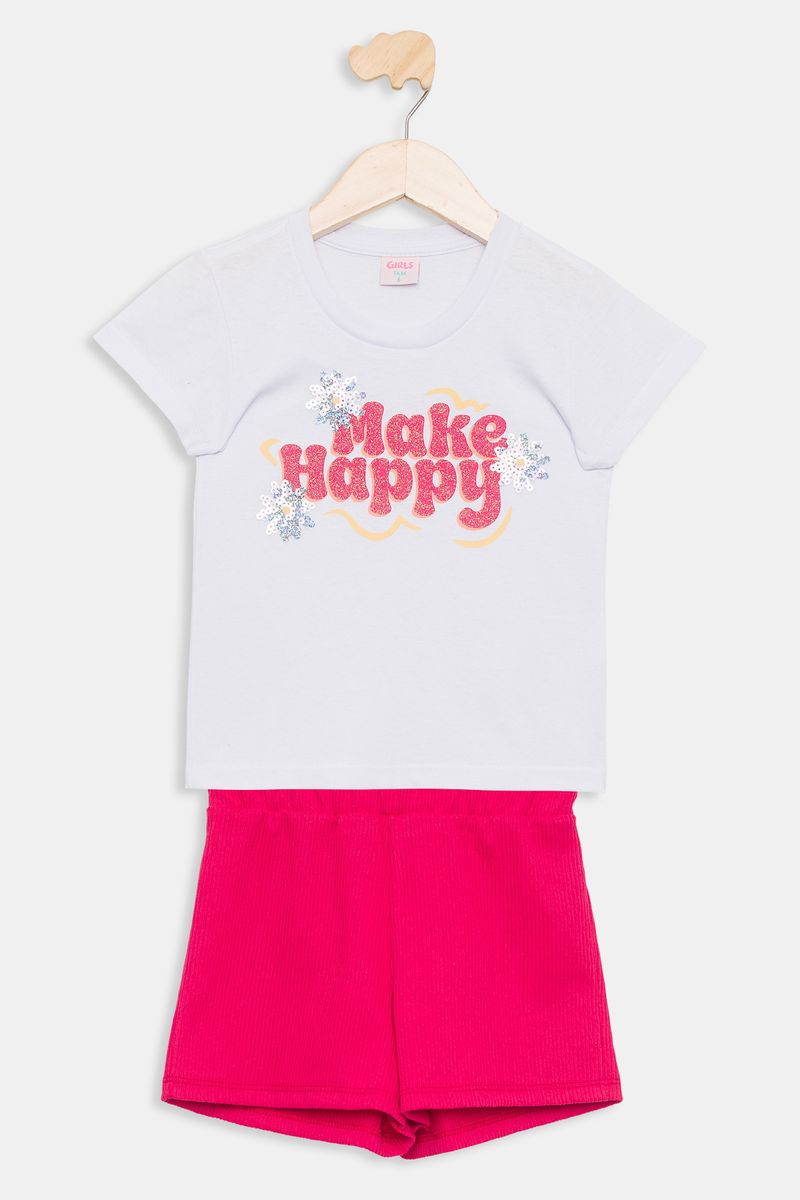 O Conjunto Infantil Caedu Camiseta e Shorts em Ribana Happy Branco e Pink é ideal para um visual alegre e estiloso. Confeccionado em ribana de poliéster e algodão, oferece conforto e durabilidade. A camiseta com estampa 'Make Happy' e o short rosa vibrante criam um look moderno e divertido. Perfeito para a moda infantil.