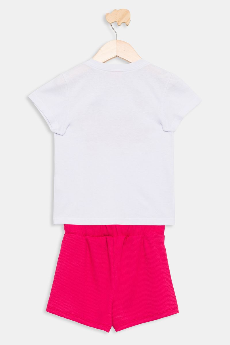 Combine este conjunto com tênis brancos para um look casual e divertido, ou sapatilhas coloridas para um toque mais charmoso. Adicione laços de cabelo ou tiaras que harmonizem com o rosa do shorts. Para dias mais frescos, uma jaqueta jeans leve complementa o visual com estilo, criando um look versátil e cheio de personalidade para as pequenas.