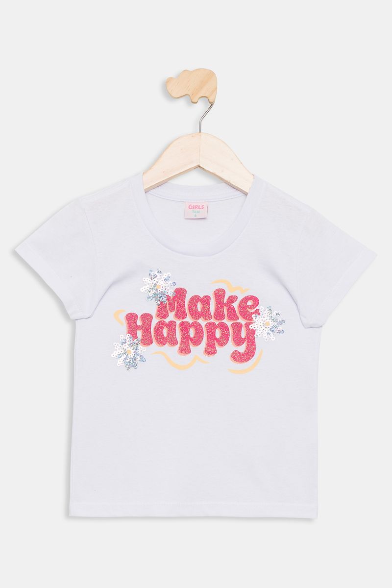 Detalhes da camiseta: Estampa "Make happy", arranjos florais, lantejoulas