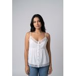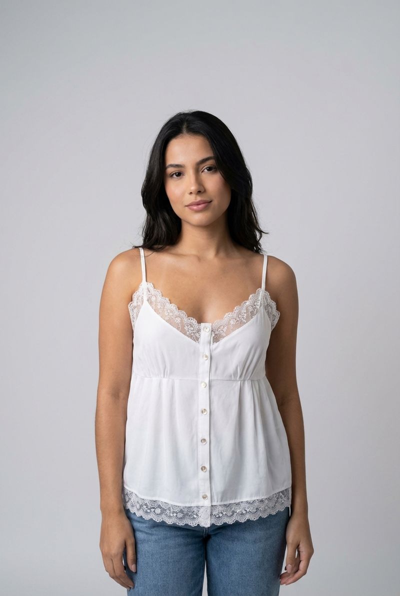 Detalhes: Renda delicada, botões frontais, decote em V, alças finas, efeito franzido na barra