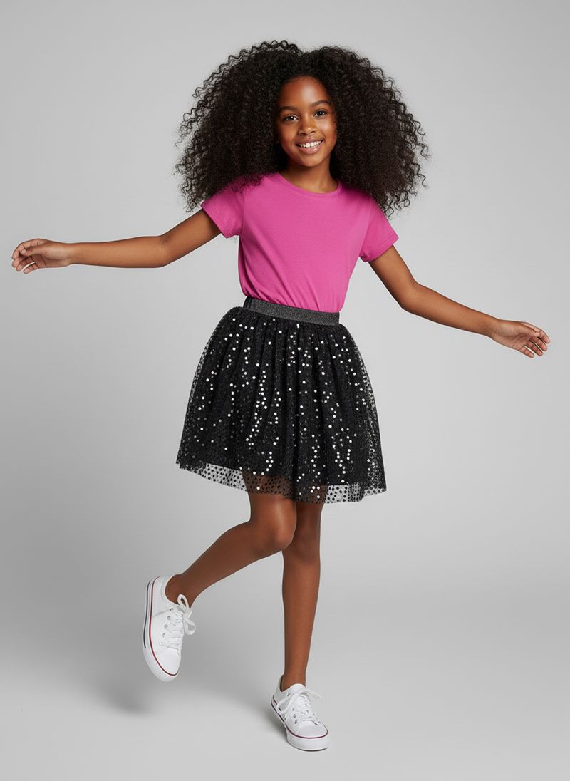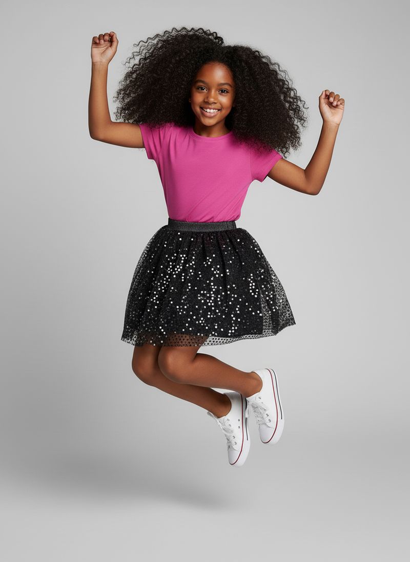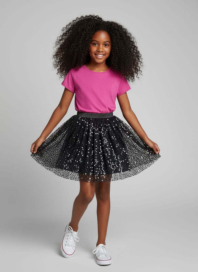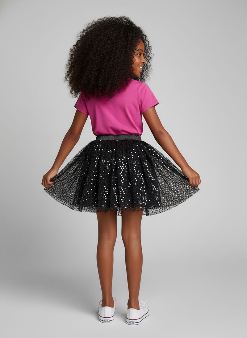 A Saia Infantil de Tule Preta com Paetês Cintilantes Caedu é a peça ideal para adicionar magia. Em tule 100% poliéster, com paetês brilhantes e design rodado, garante um visual encantador e confortável.
