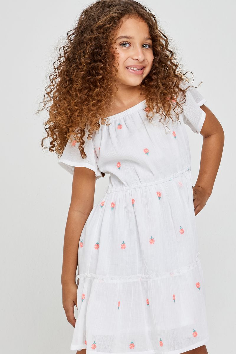 Desperte a magia no guarda-roupa da sua pequena com o Vestido Infantil Caedu Off White. Confeccionado em 95% cotton, ele oferece conforto e leveza. Seu design com ombros descobertos, mini bordado floral e delicados babados garante um visual encantador e cheio de estilo para todas as ocasiões.