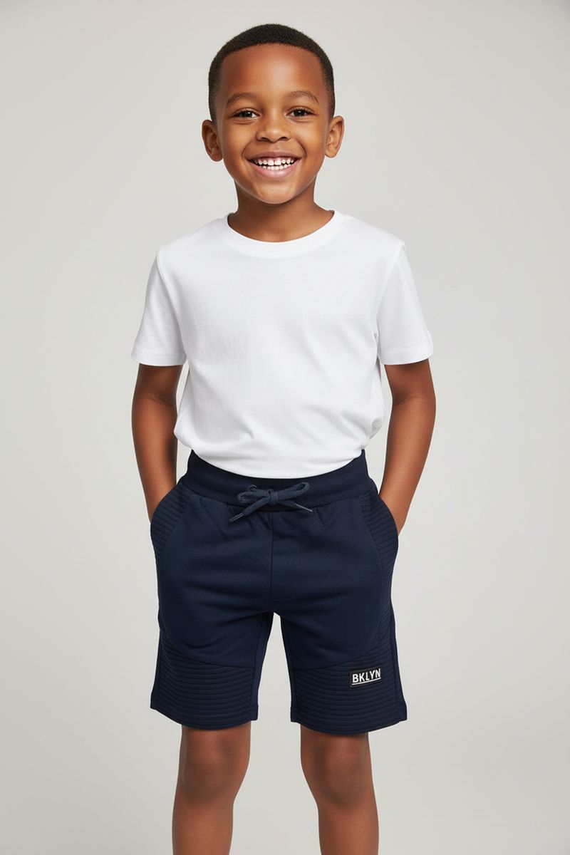A Bermuda Infantil de Moletom Caedu BKLYN oferece conforto e estilo para o dia a dia. Com design azul-marinho e detalhes acolchoados, possui cós ajustável e aplique "BKLYN", garantindo um visual moderno e liberdade para brincar. Perfeita para a moda infantil.