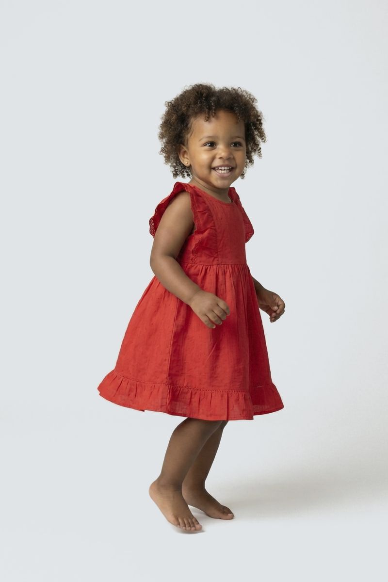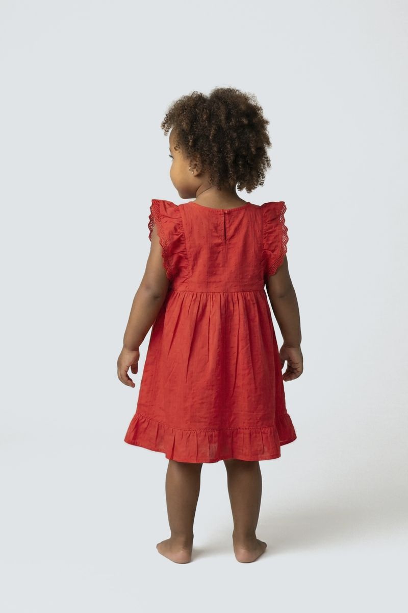 Vestido Infantil Vermelho Dobby com Babados Delicados Caedu: Conforto e estilo para sua pequena!