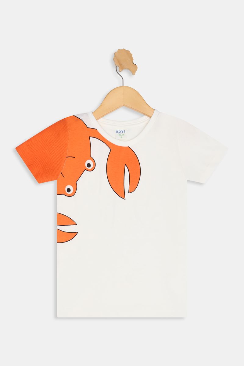 Detalhes da camiseta: Estampa de caranguejo, manga esquerda laranja, gola redonda