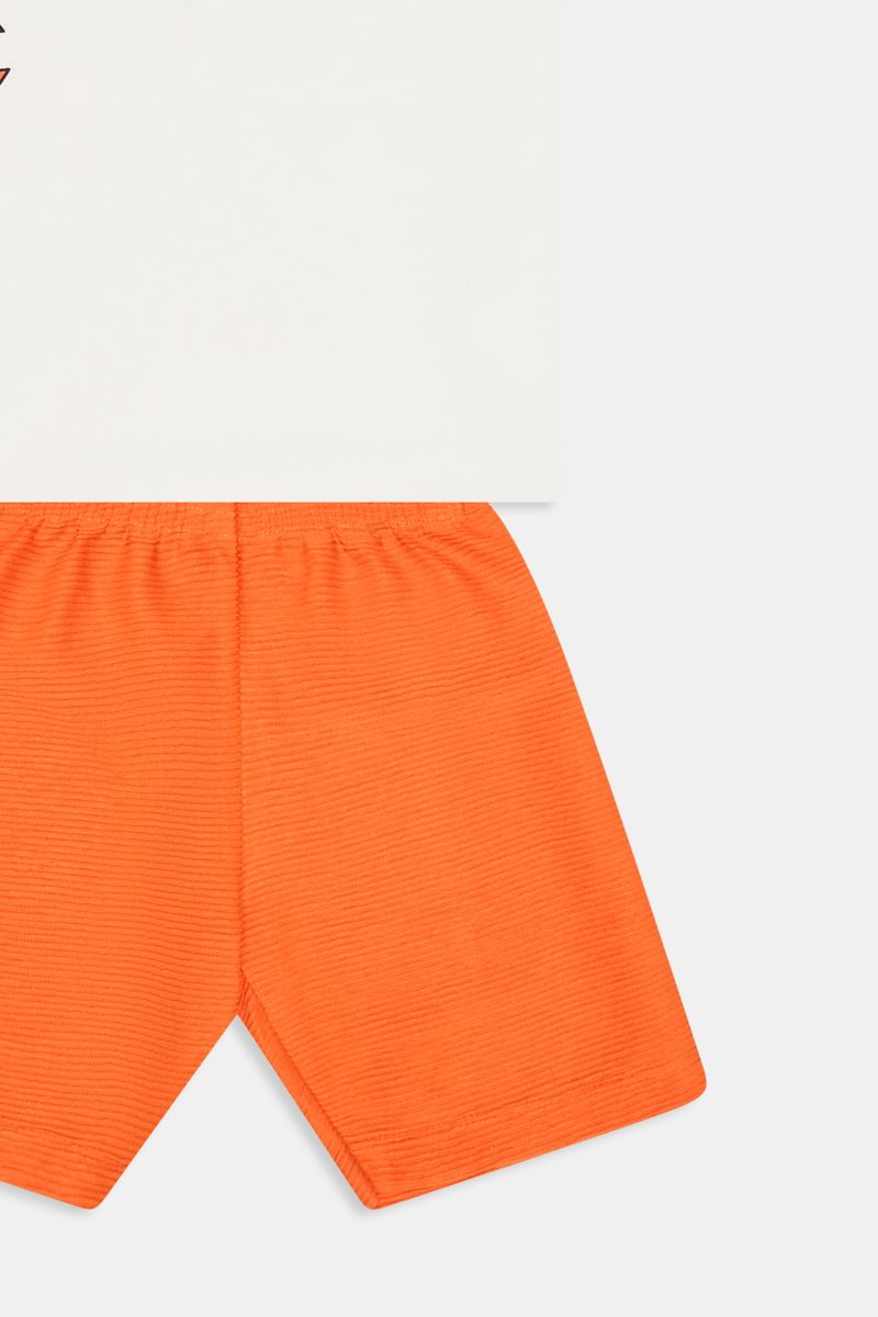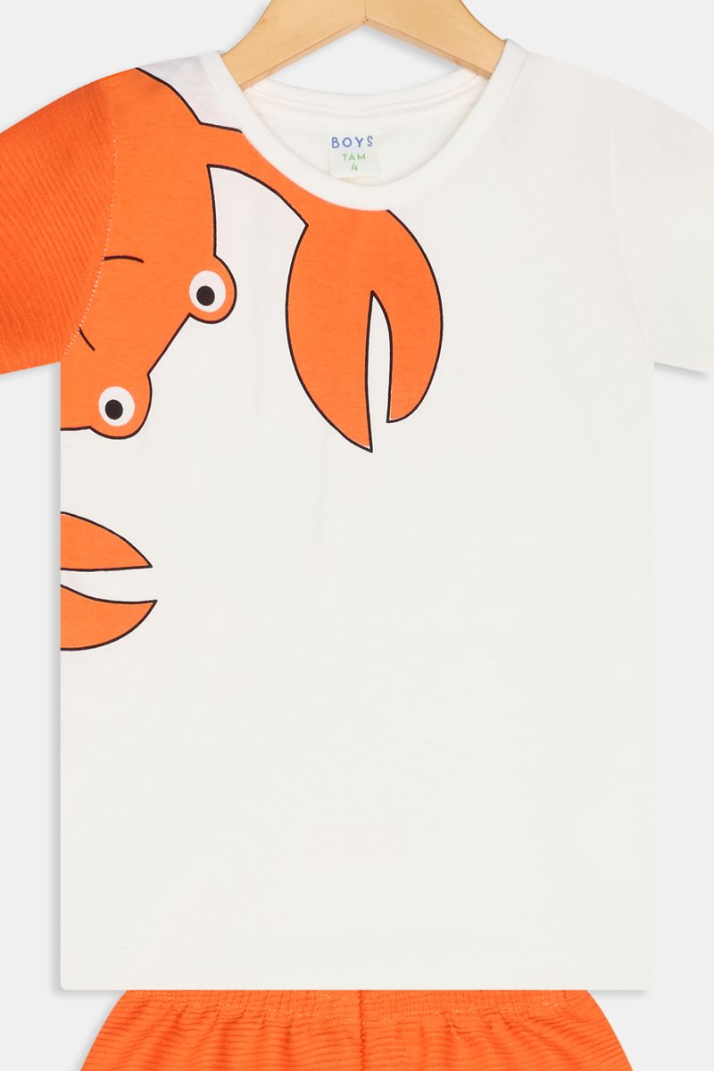 Conforto e estilo para seu pequeno com o Conjunto Infantil Caedu Caranguejo Laranja! Em 100% algodão, a camiseta off white com estampa vibrante e o short laranja de meia malha são ideais para o dia a dia. Um conjunto infantil da Caedu.