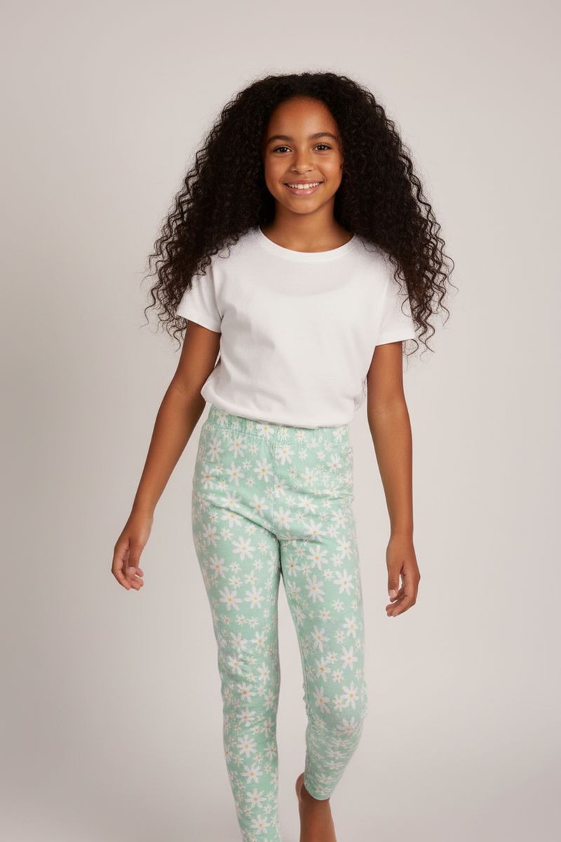Combine a Legging Infantil Estampada de Margaridas Verde Menta com blusas lisas em tons de branco ou amarelo para um visual harmonioso. Adicione um tênis confortável para brincar ou uma sapatilha para um toque mais delicado. Uma jaqueta leve completa o look em dias mais frescos.