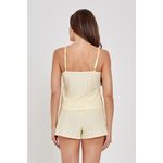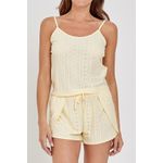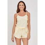 Sinta o conforto do Pijama Curto Laise Amarelo Claro Caedu. Conjunto de moda íntima com camisete e shorts, feito em 100% poliéster e laise. Uma roupa leve e charmosa para seu descanso.