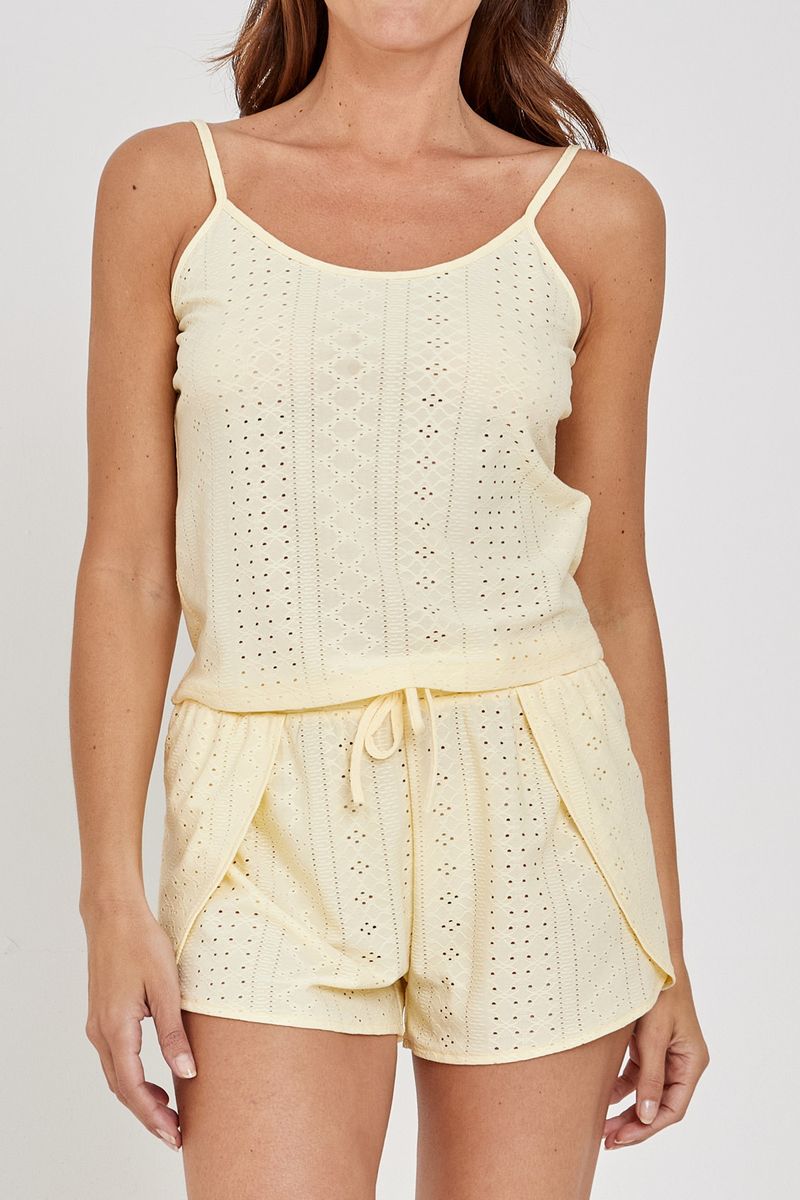 Detalhes: Camisete de alça fina, shorts com amarração, padrão de renda vazada