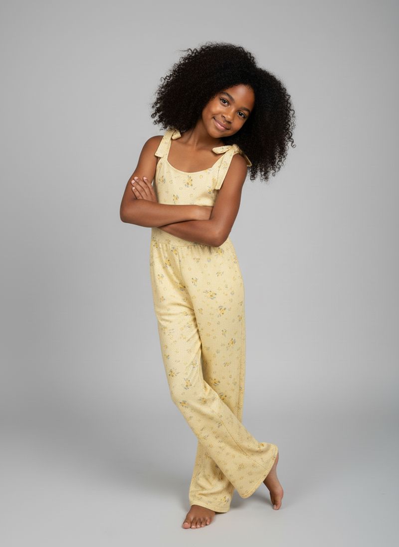 Combine o Macacão Infantil Amarelo Sol Floral com sandálias ou sapatilhas para um look casual e confortável. Para um toque extra de estilo, adicione uma jaqueta jeans em dias mais frescos ou um cardigan leve. Complete com acessórios de cabelo delicados para um visual encantador e completo.