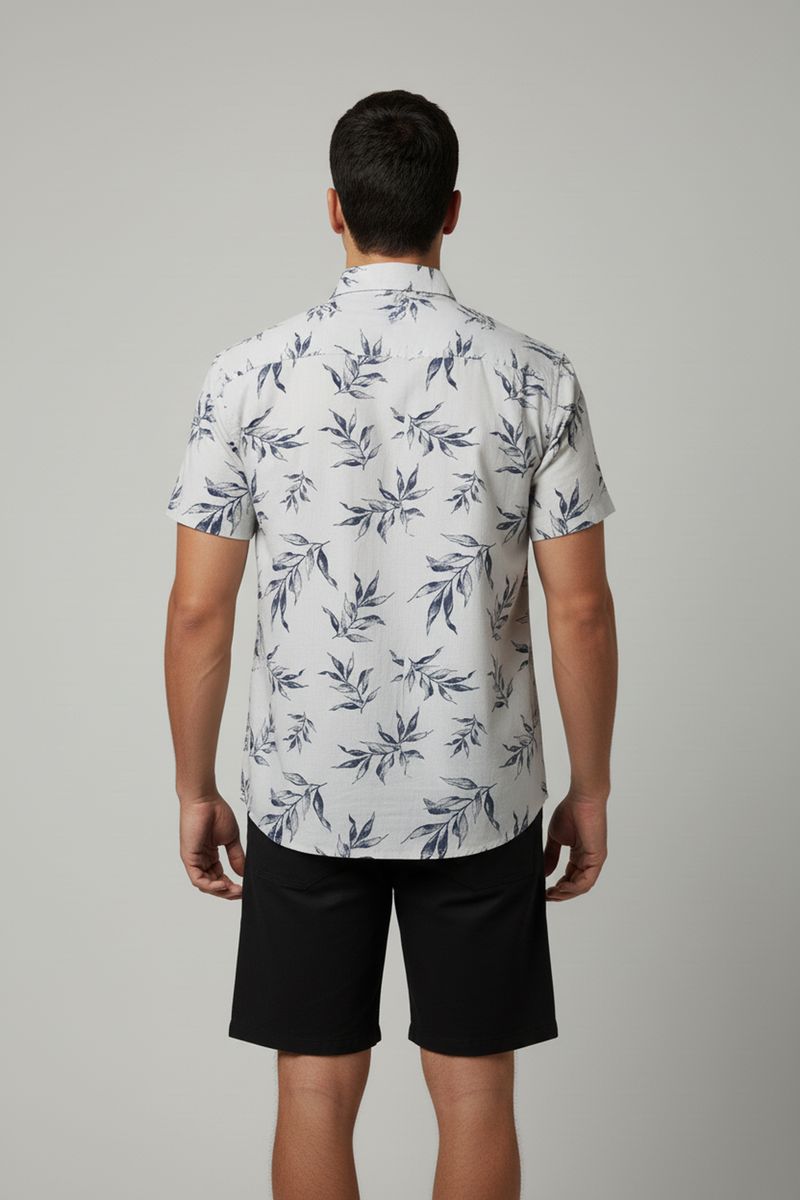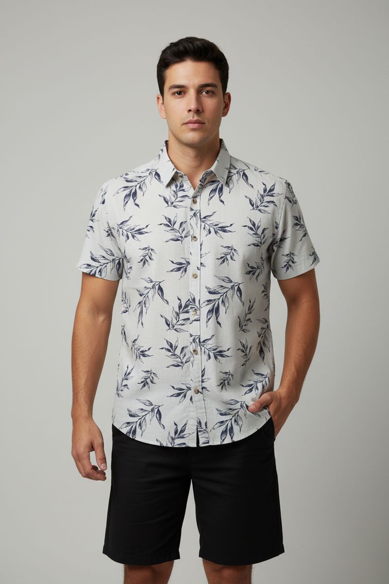 A Camisa Masculina Casual Caedu oferece um estilo moderno e descontraído. Confeccionada em 100% algodão com efeito linho e tecido alfaiataria, possui estampa de folhas e manga curta, ideal para quem busca roupas de moda e conforto.