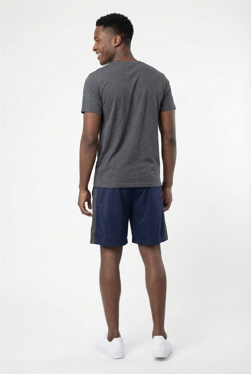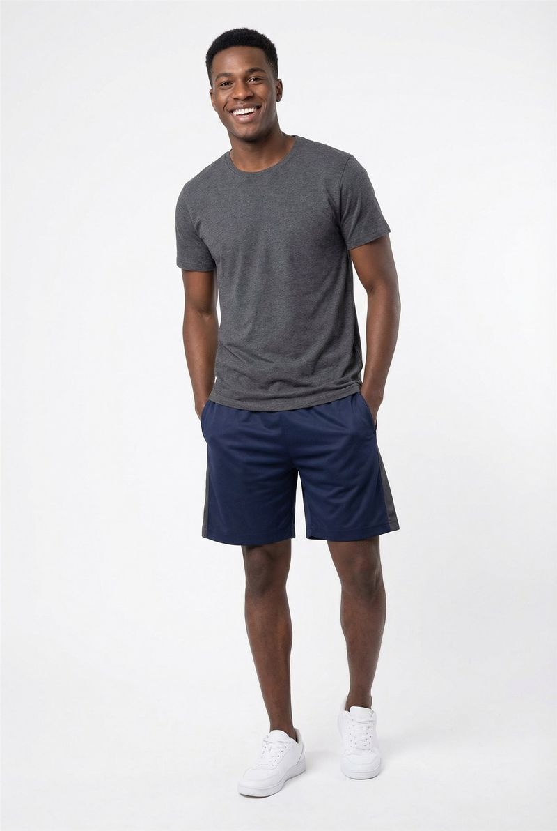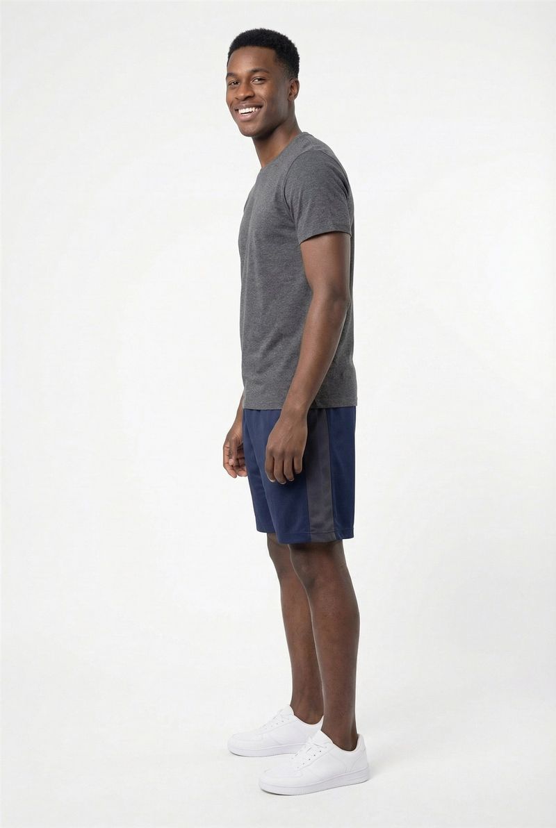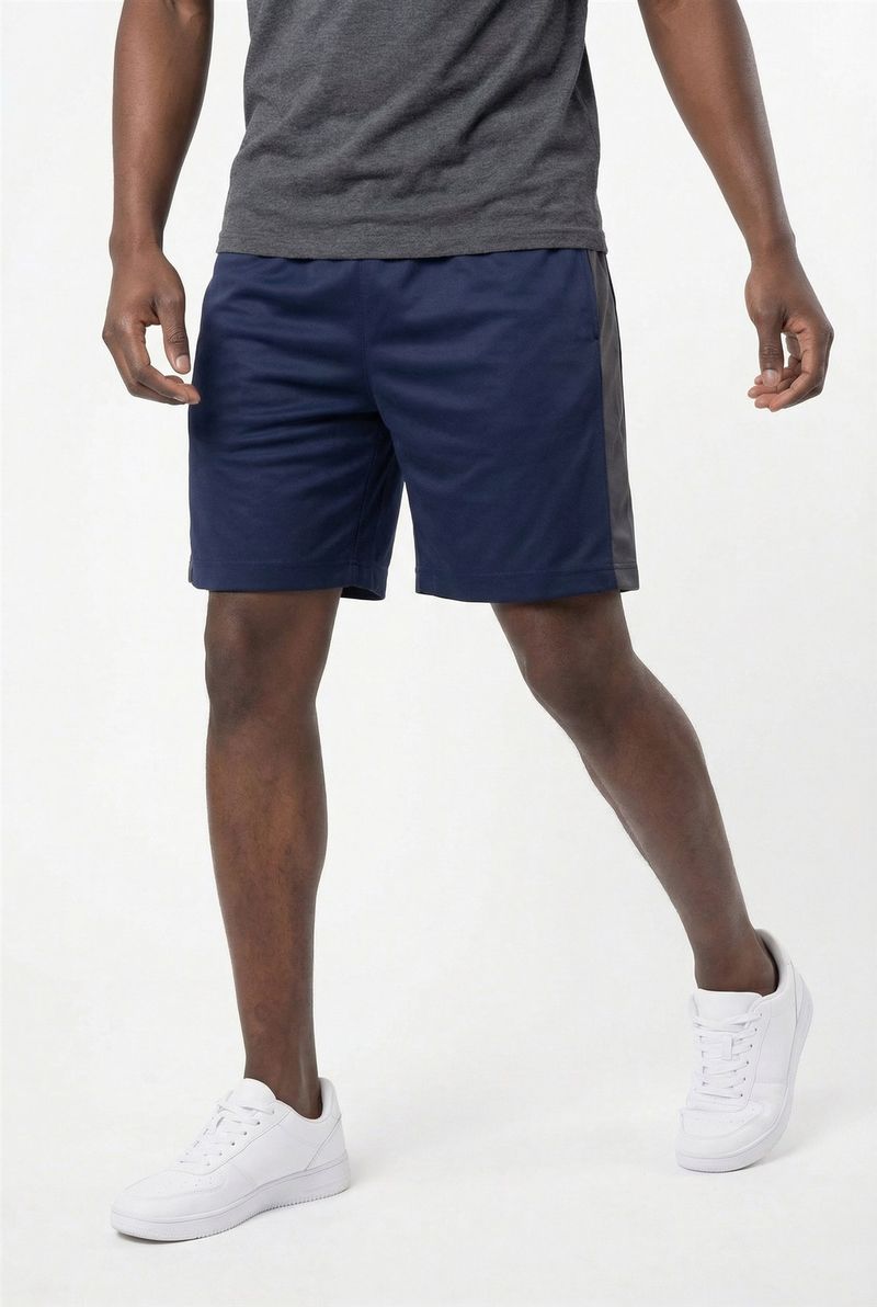 Eleve seu desempenho e estilo com o Shorts Masculino Esportivo Dry Fit Mesh Caedu. Ideal para suas atividades, oferece máximo conforto e liberdade. Em azul escuro com faixa lateral cinza, sua composição de 98% poliéster e 2% elastano garante flexibilidade e um caimento perfeito, mantendo você seco.