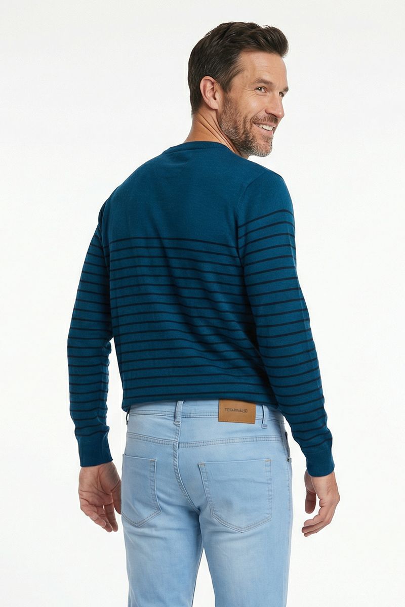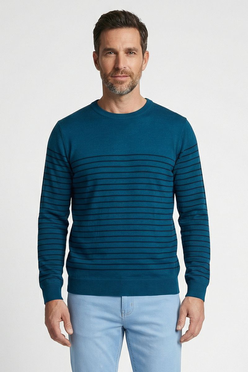 O Suéter Masculino Gola Careca Listrado Azul Profundo Caedu oferece estilo e conforto. Em tricot 100% poliéster, garante toque macio e durabilidade. Seu design listrado e gola careca proporciona um visual sofisticado e versátil.
