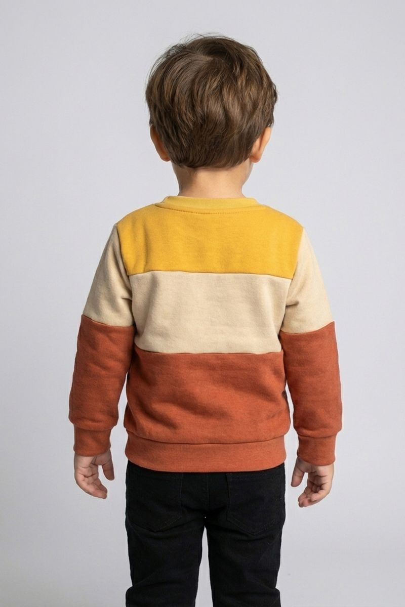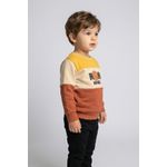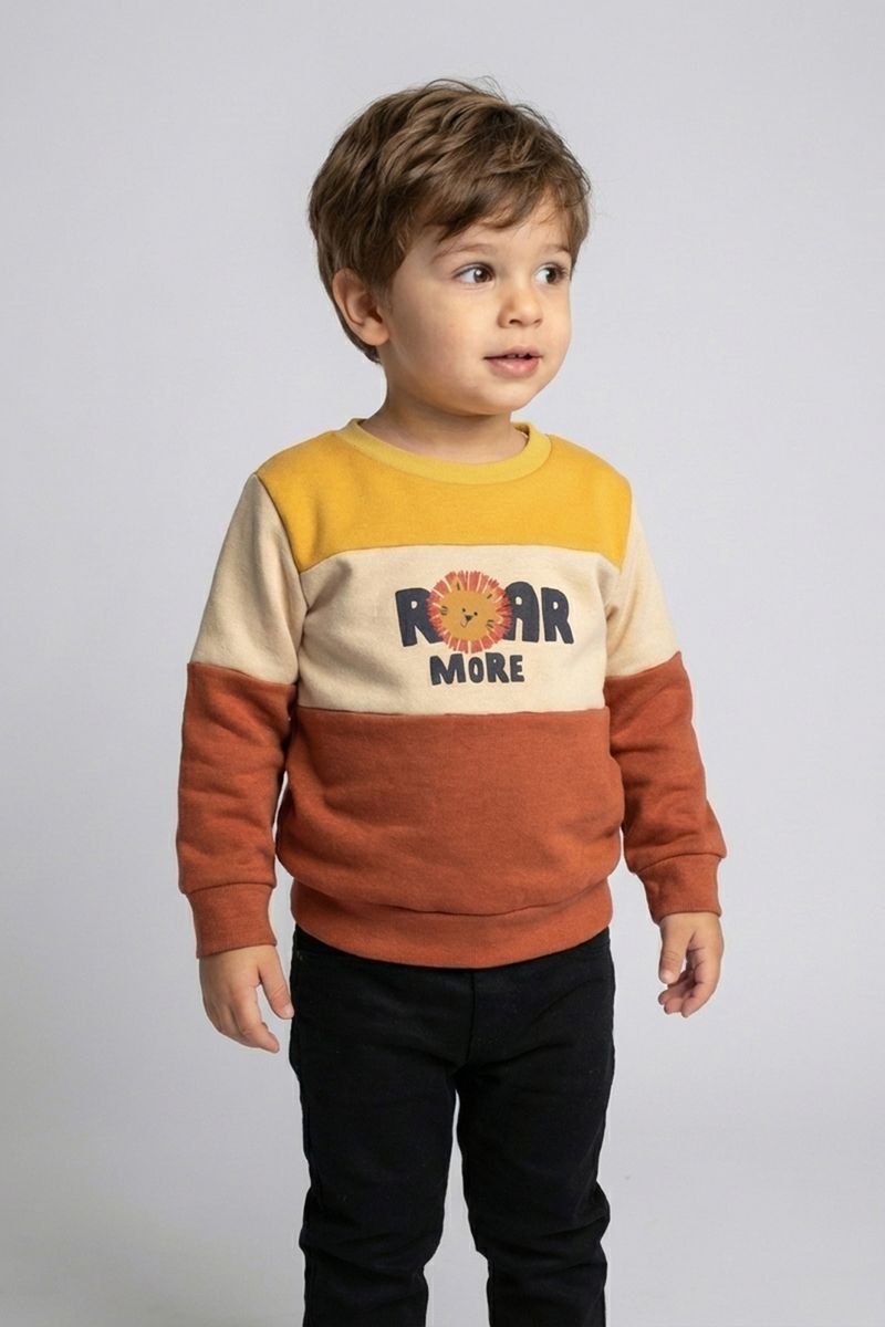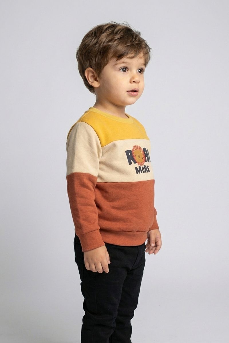 O Moletom Infantil Leão 'ROAR MORE' Color Block oferece conforto e estilo. Em moletom com felpa, garante maciez. Com design vibrante color block e estampa de leão, é ideal para a moda infantil, adicionando personalidade e diversão ao look.