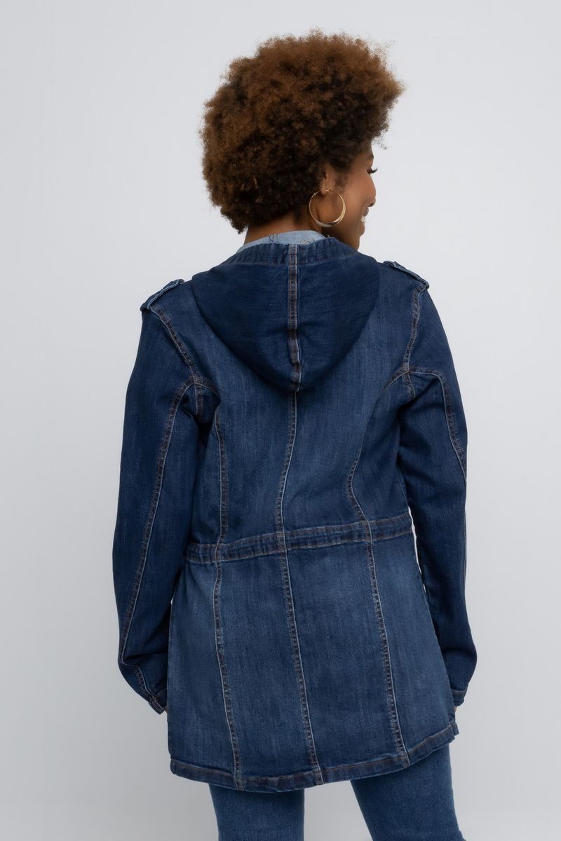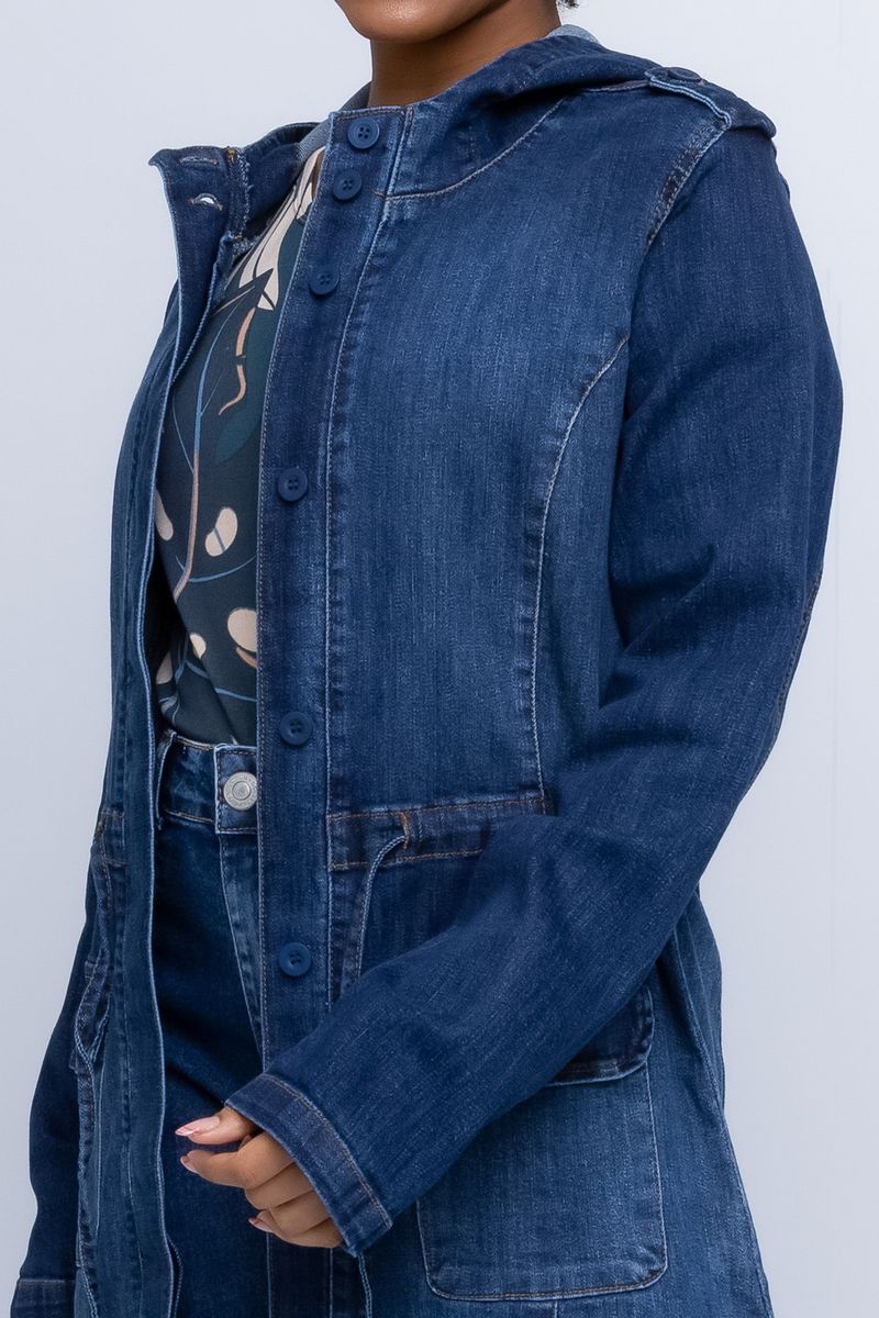 Jaqueta parka feminina em jeans média, com capuz e cordão de amarração cintura. Possui fechamento com botões e cinto no mesmo tecido.A peça é pura elegância e no pode faltar no guarda-roupa de toda mulher que gosta de arrasar nos looks.