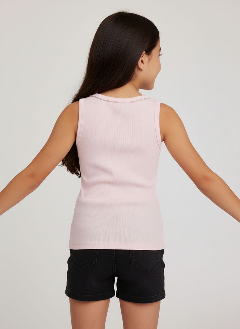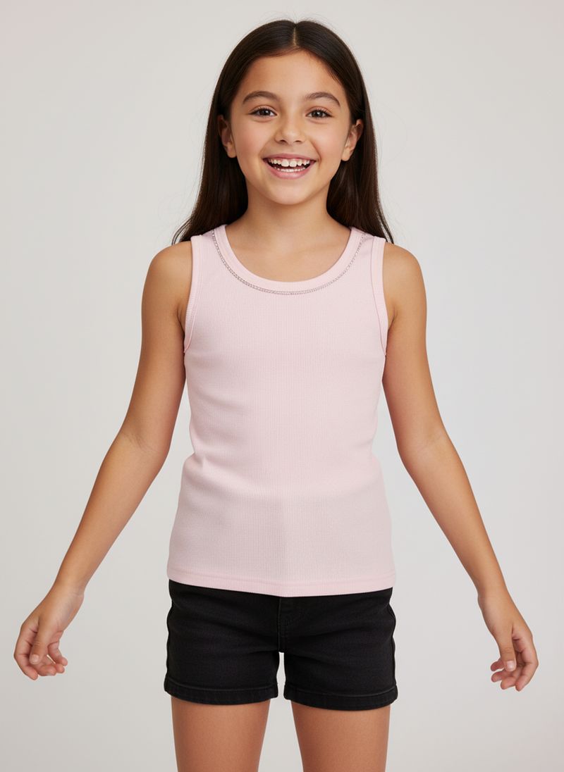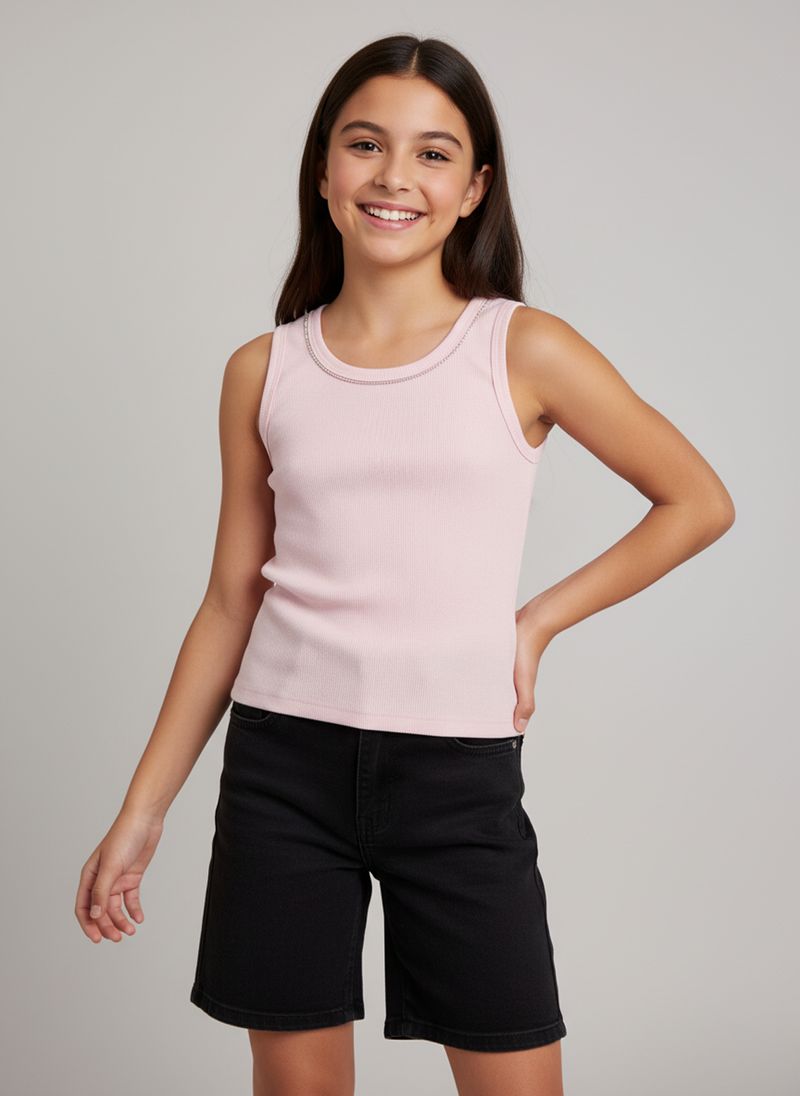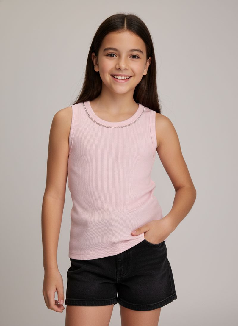 A Regata Juvenil Canelada Rosa Claro com Detalhes de Strass Caedu é a escolha perfeita para um look cheio de estilo e conforto. Com sua textura canelada e o brilho sutil dos strass no decote, esta roupa oferece um toque de charme para o dia a dia. Ideal para quem busca moda e versatilidade.