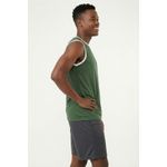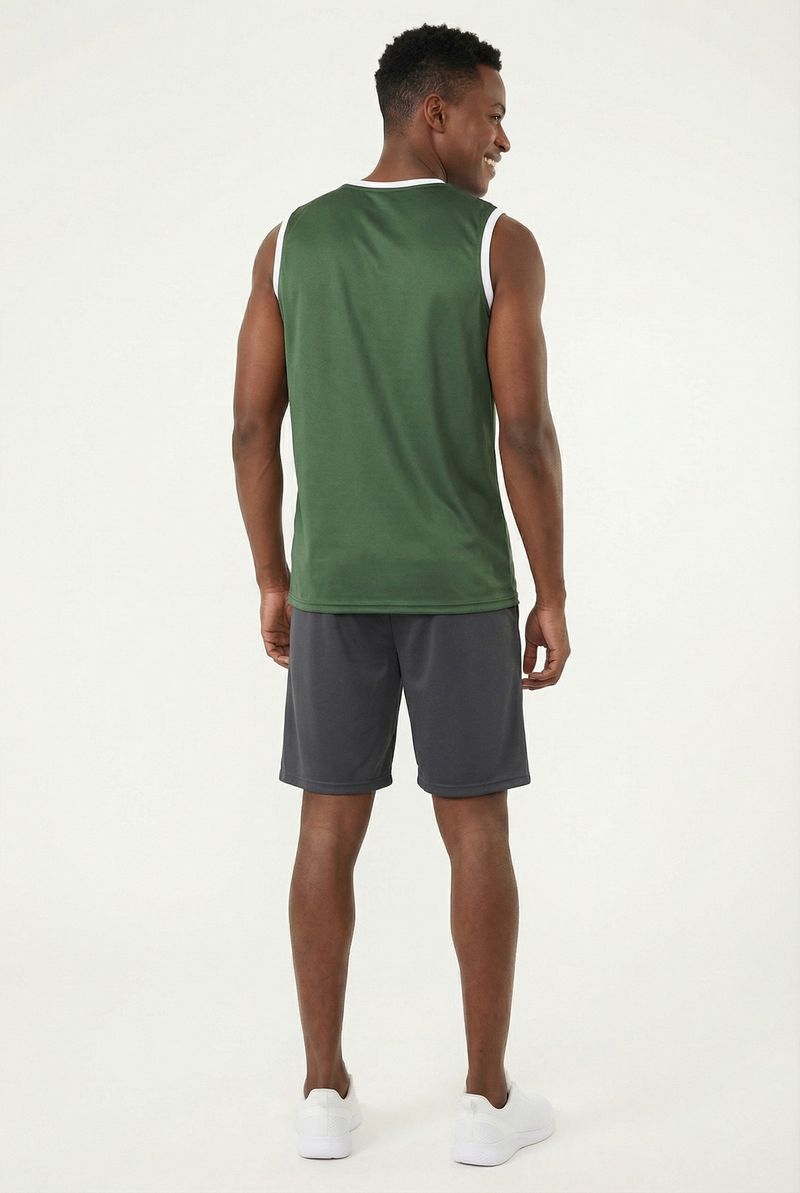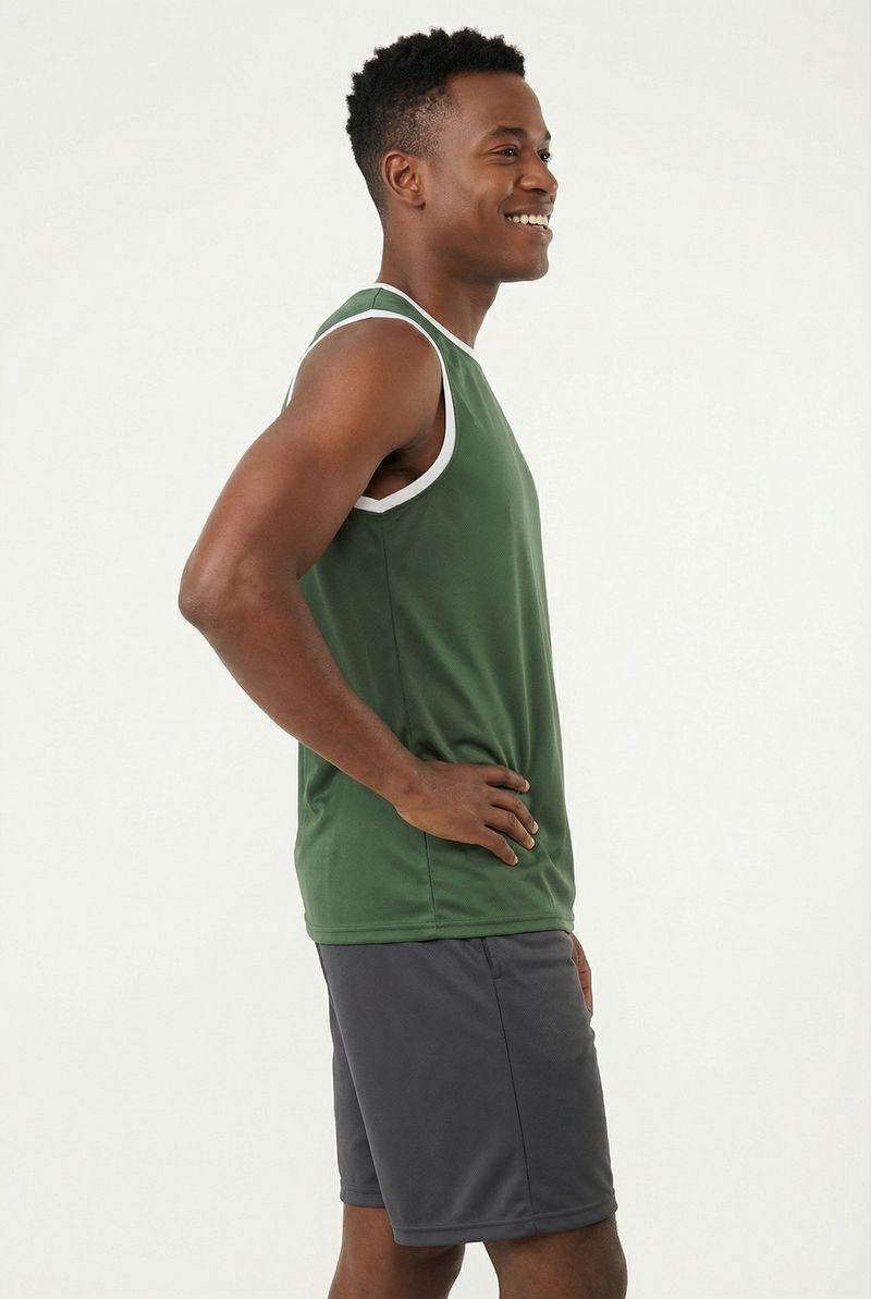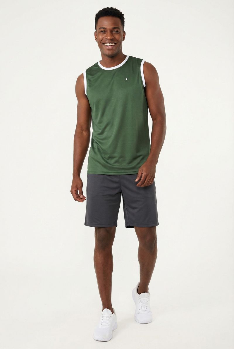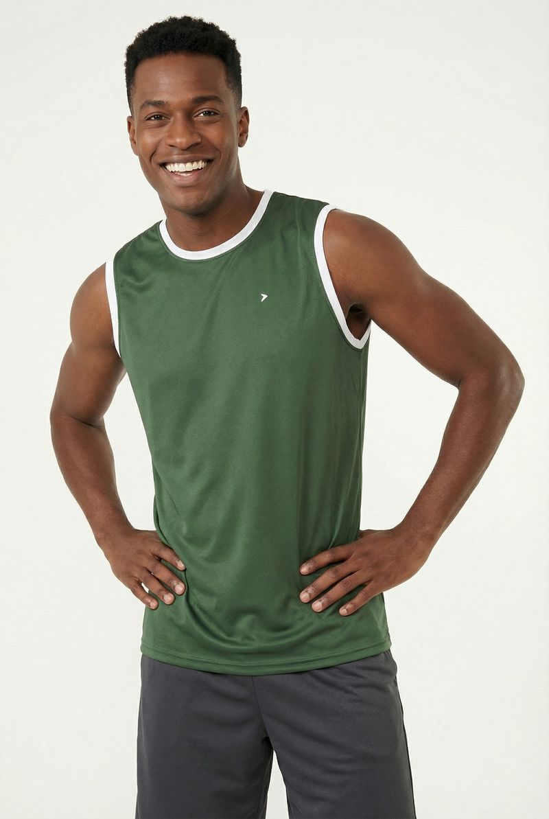 A Regata Masculina Esportiva Caedu, em verde pistache, eleva sua moda. Conforto e performance com 100% Poliéster DRY. Gola e cavas em contraste branco. Ideal para treinos e um visual moderno.
