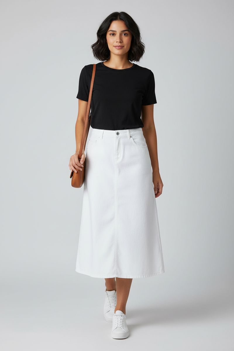 Combine a Saia Midi Feminina Off White de Sarja Casual Caedu com uma camiseta preta básica para um visual despojado, ou uma blusa de tecido leve para um toque mais sofisticado. Nos pés, tênis brancos trazem conforto e estilo, enquanto sandálias ou sapatilhas elevam a produção. Adicione uma bolsa carteiro para completar o look com praticidade e charme.