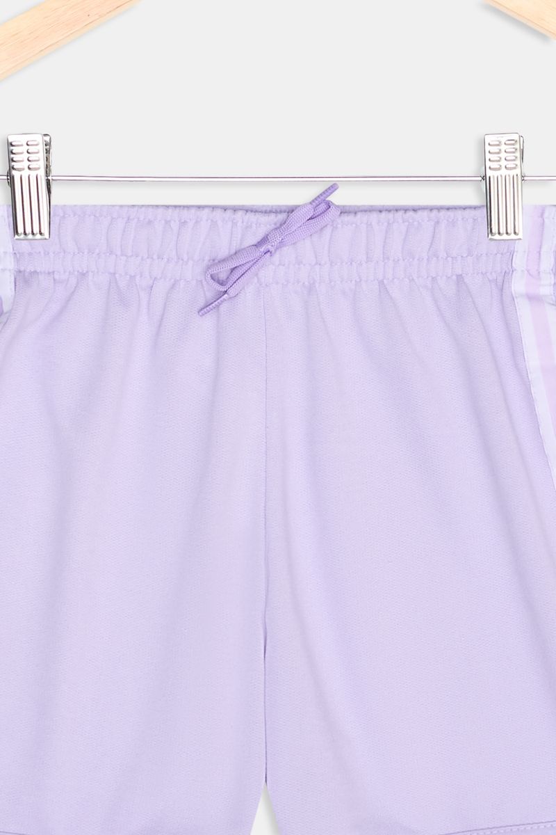 Detalhes: Cós elástico, cadarço ajustável, listras laterais brancas e lilás