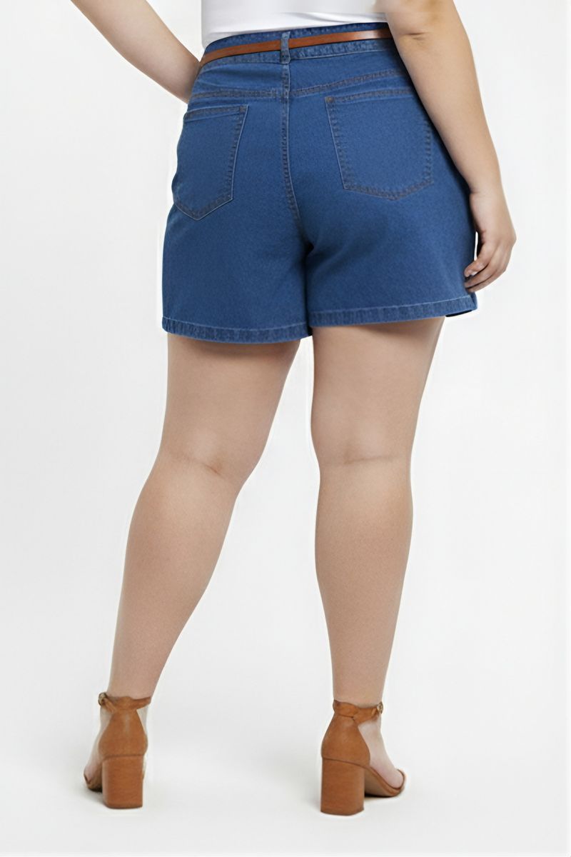 O Shorts Jeans Plus Size Azul Médio Caedu é a peça ideal. Em sarja 100% algodão, oferece conforto e caimento perfeito. O cinto marrom incluso adiciona um toque de moda. Essencial para o guarda-roupa feminino.