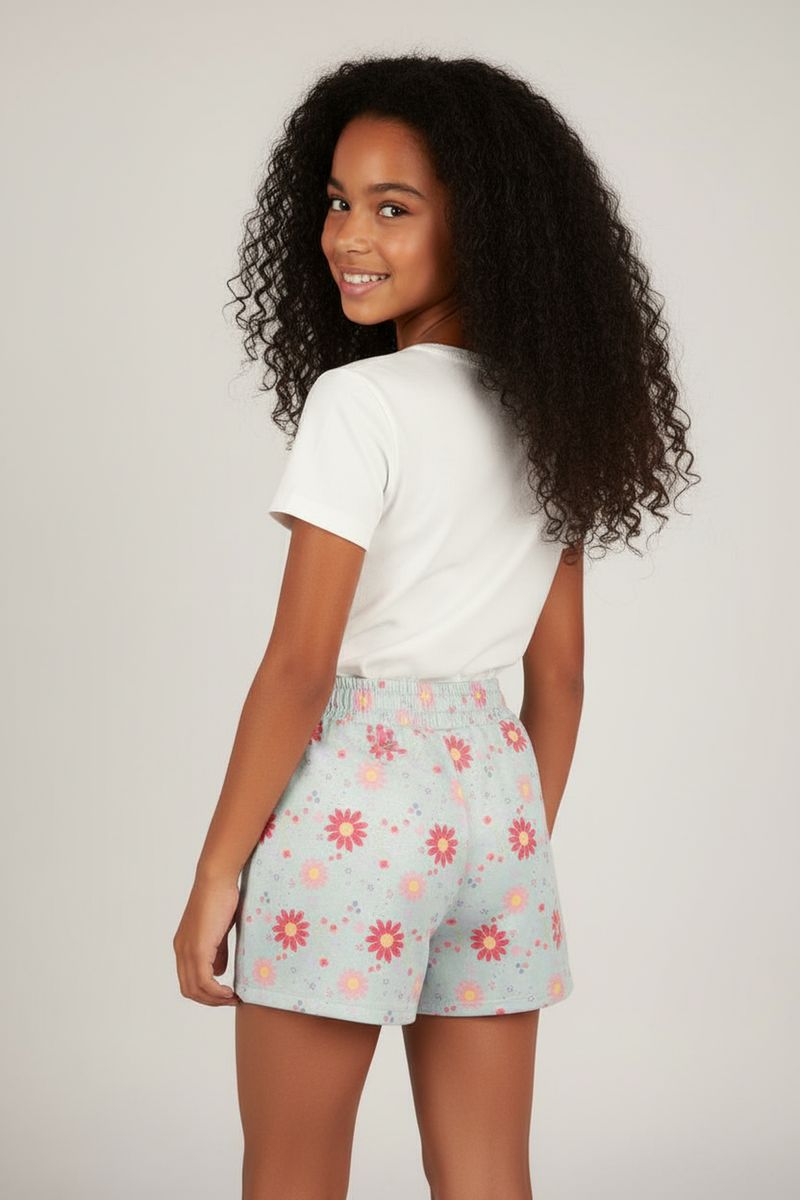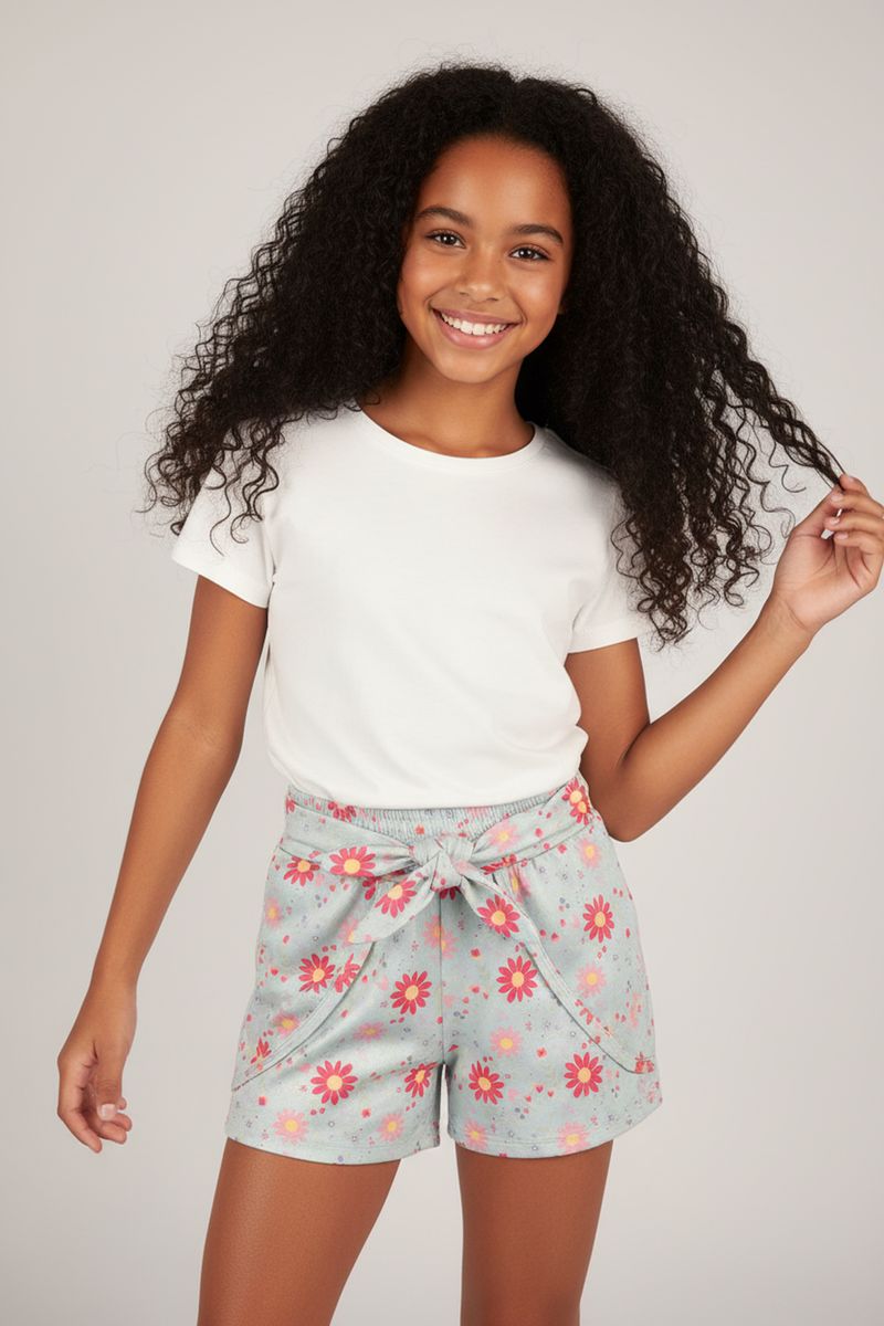 Combine o shorts floral com uma blusa branca básica ou uma regata colorida para um visual casual e despojado. Para os pés, sandálias ou tênis casuais são ótimas escolhas. Adicione uma jaqueta jeans leve para um toque extra de estilo em dias mais frescos, ou acessórios como uma tiara para completar o look com charme.