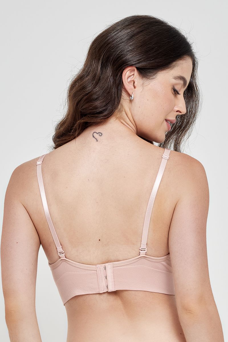 Sutiã sem costura com bojo moldado. Cor bege médio. Prático e discreto.