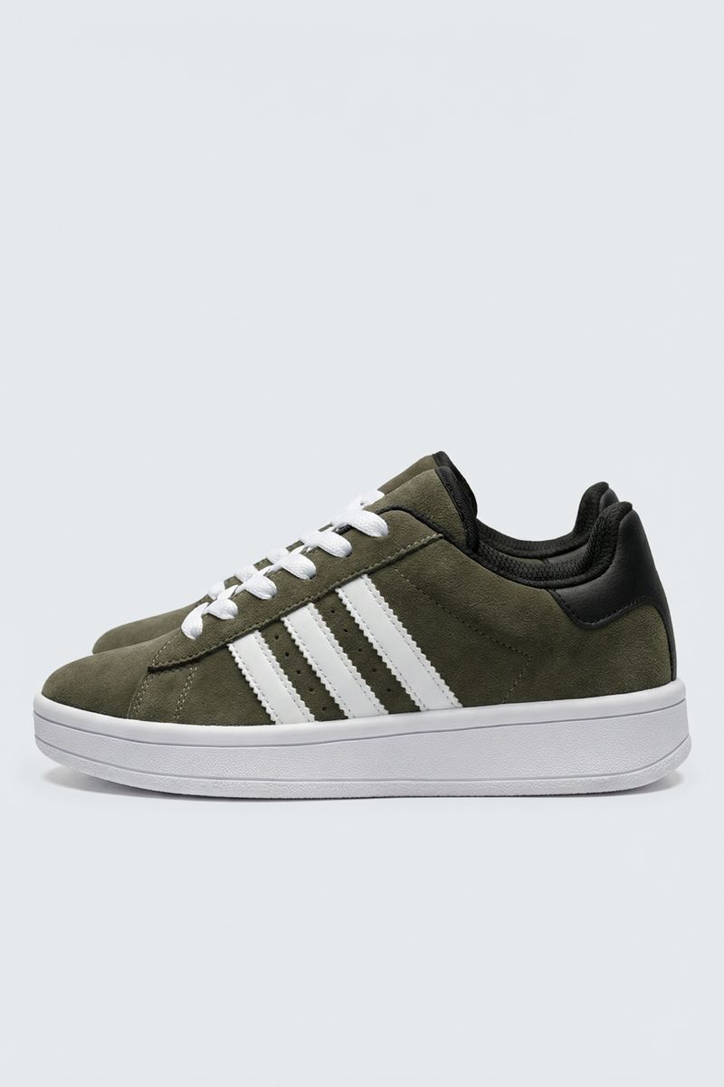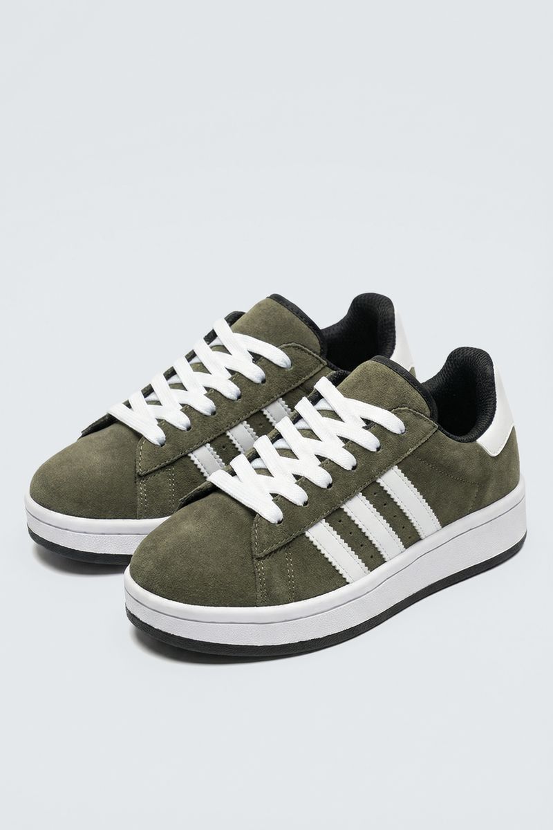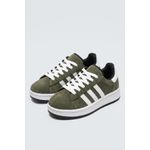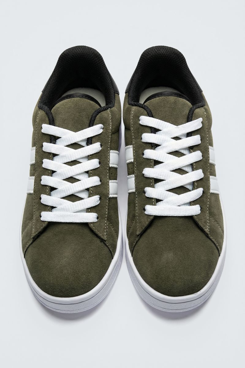O Tênis Infantil Masculino Caedu oferece moda e conforto. Com camurça verde oliva e listras brancas, ele garante um visual moderno. A sola de borracha proporciona durabilidade para as aventuras dos pequenos.