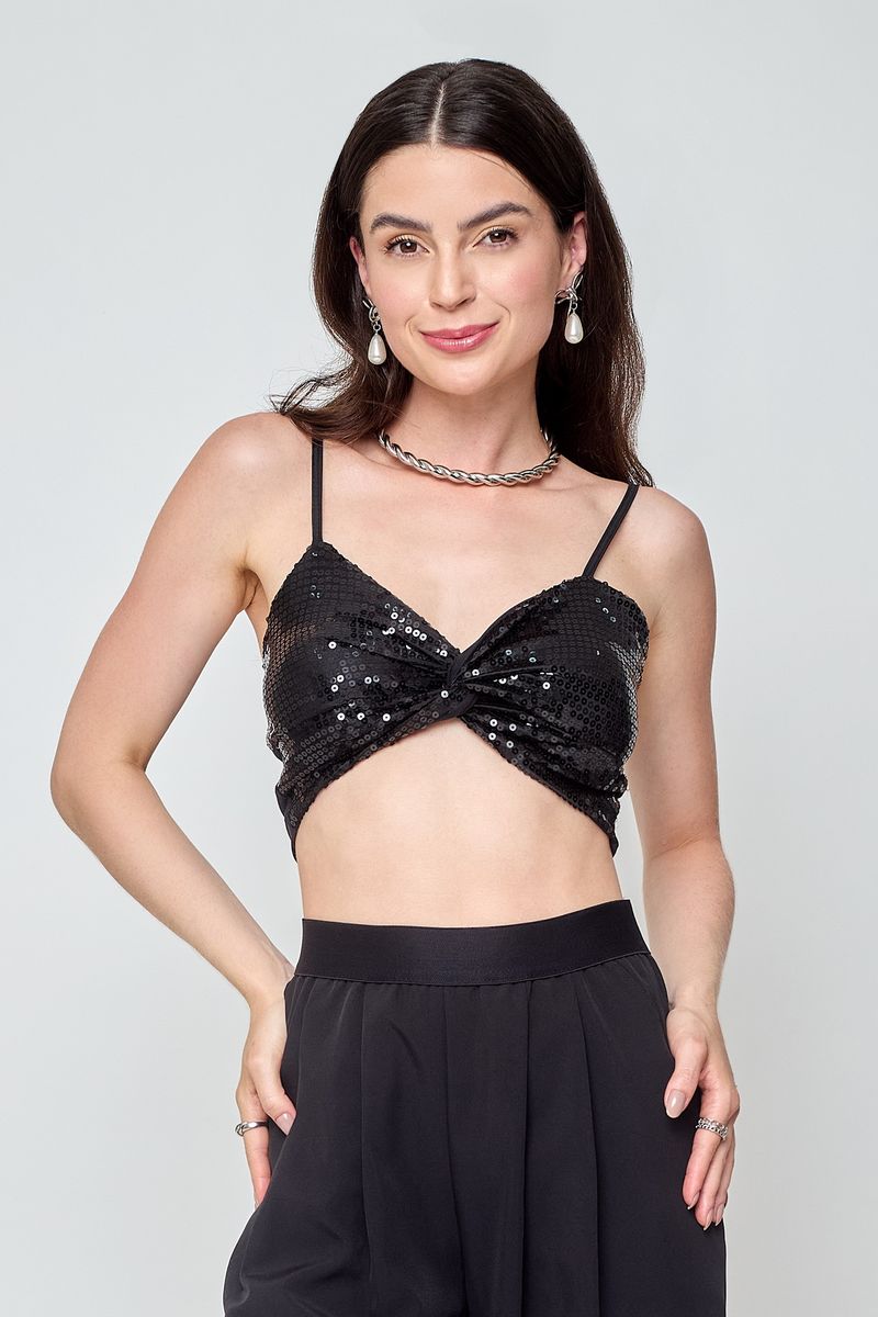 Combine o Top Feminino Fashion Cropped com Paetê Preto Caedu com calças pretas de corte reto ou wide leg pants para um look elegante. Adicione um blazer ou uma jaqueta de couro para um toque moderno. Complete com salto alto e um colar prateado para realçar o brilho, criando um visual fashion e impactante para qualquer evento noturno.