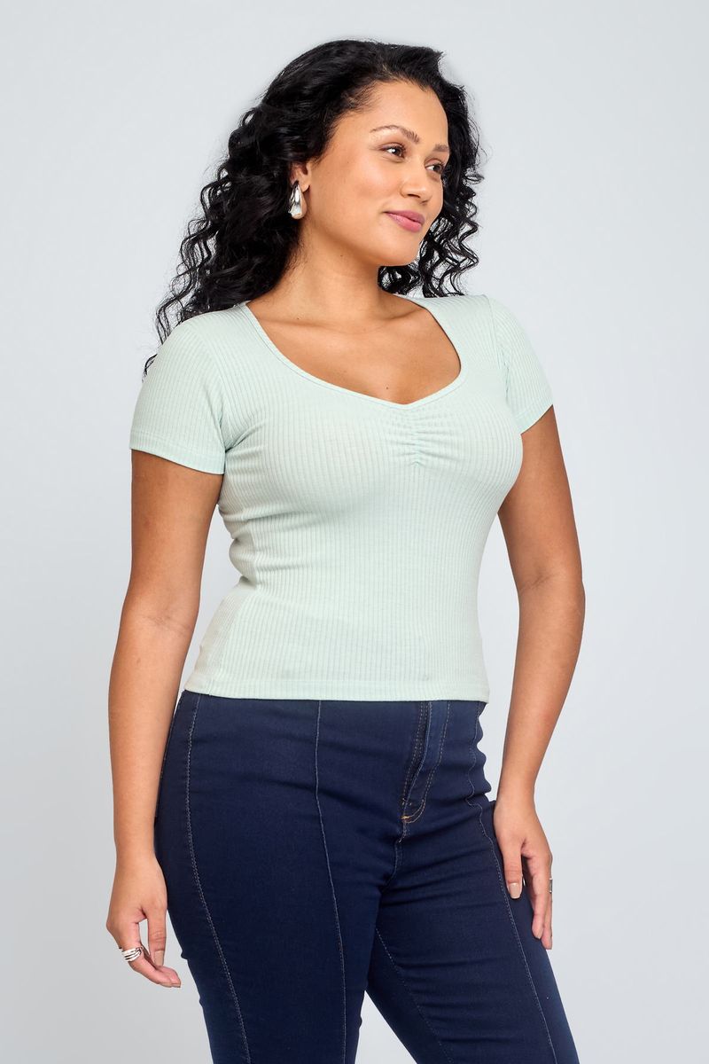 Descubra o Top Feminino Franzido Verde Claro Caedu, a roupa perfeita para um look casual e fresco. Com design de manga curta e detalhe franzido, este top em ribana oferece conforto e estilo, ideal para quem busca moda e qualidade.