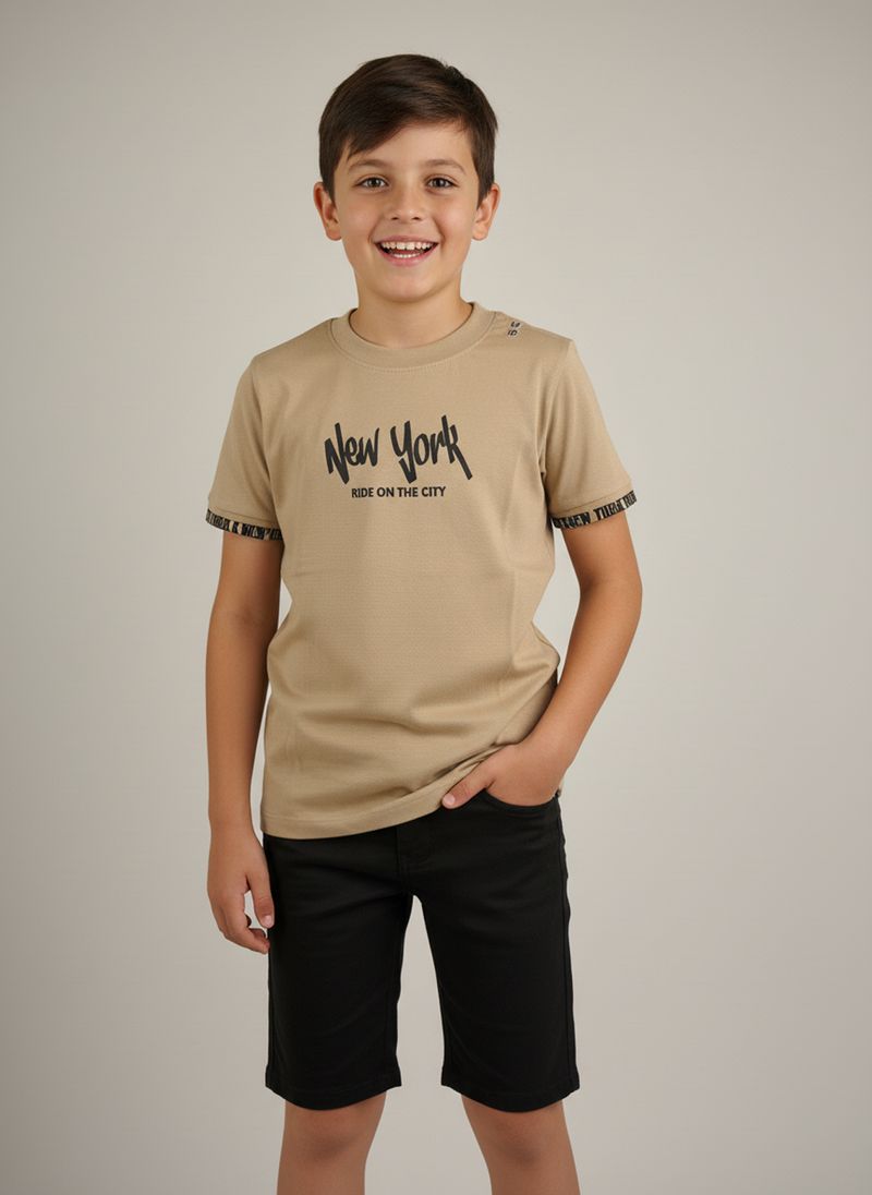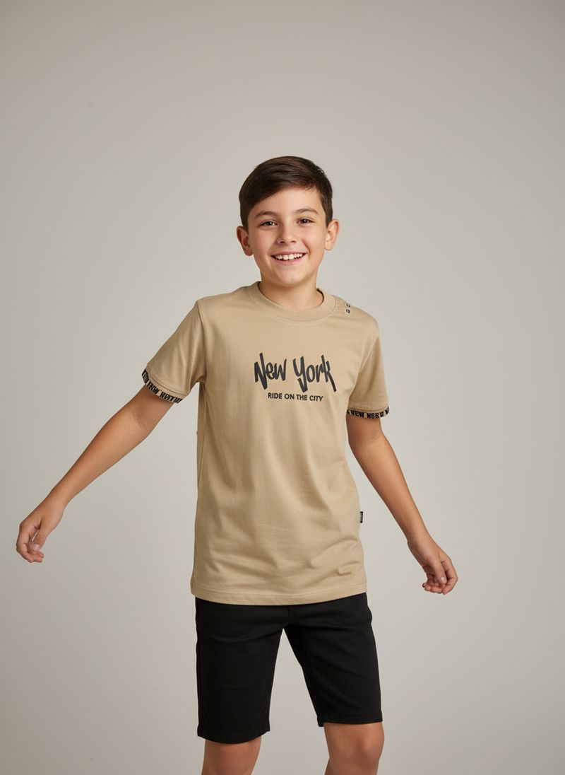 Prepare seu pequeno para a aventura urbana com a Camiseta Menino Caedu New York Ride The City Urbana Bege Claro. Confeccionada em 100% algodão e meia malha, oferece conforto e estilo para o dia a dia. Seu design com estampa 'New York Ride On The City' e cor bege claro garante um visual moderno e despojado, ideal para a moda infantil.