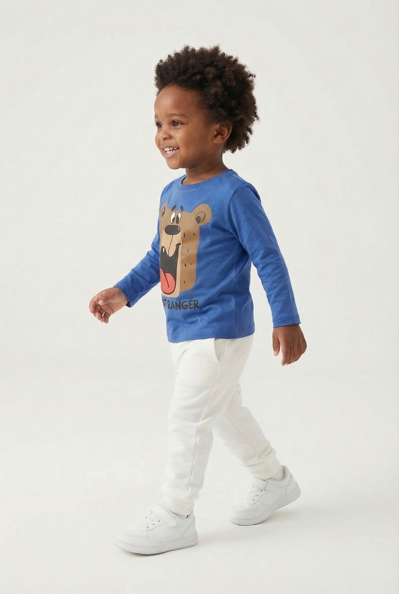 Combine esta camiseta infantil com calças jeans ou de moletom para um look casual e confortável. Para um toque despojado, adicione um colete ou jaqueta leve. Nos pés, tênis brancos ou coloridos complementam perfeitamente o visual, criando um conjunto divertido e pronto para qualquer aventura dos pequenos.