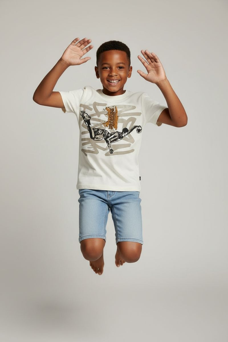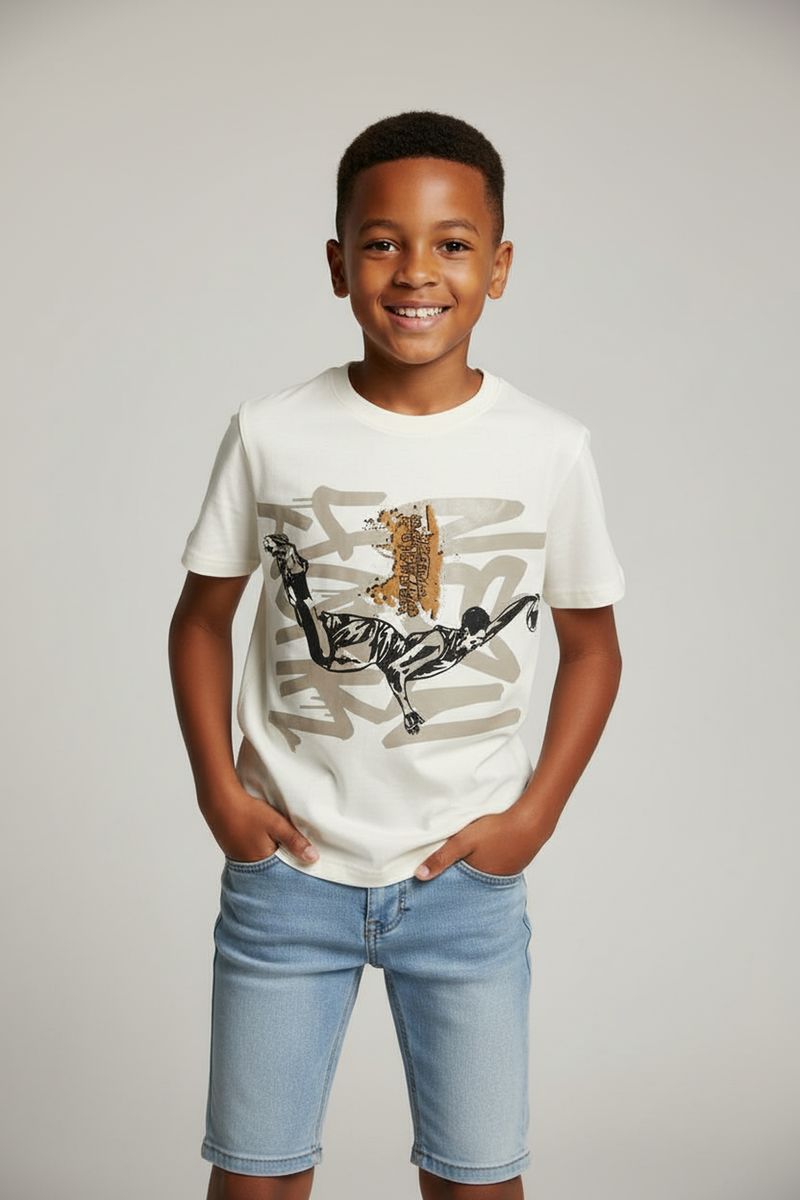 A Camiseta Juvenil Caedu Off White oferece conforto e estilo autêntico. Feita em 100% algodão de meia malha, garante liberdade de movimento e toque suave. Com estampa dinâmica de jogador de futebol e vibe street, é a roupa ideal para um visual moderno e cheio de personalidade. Encontre esta moda na Caedu com preço bom.
