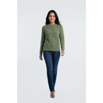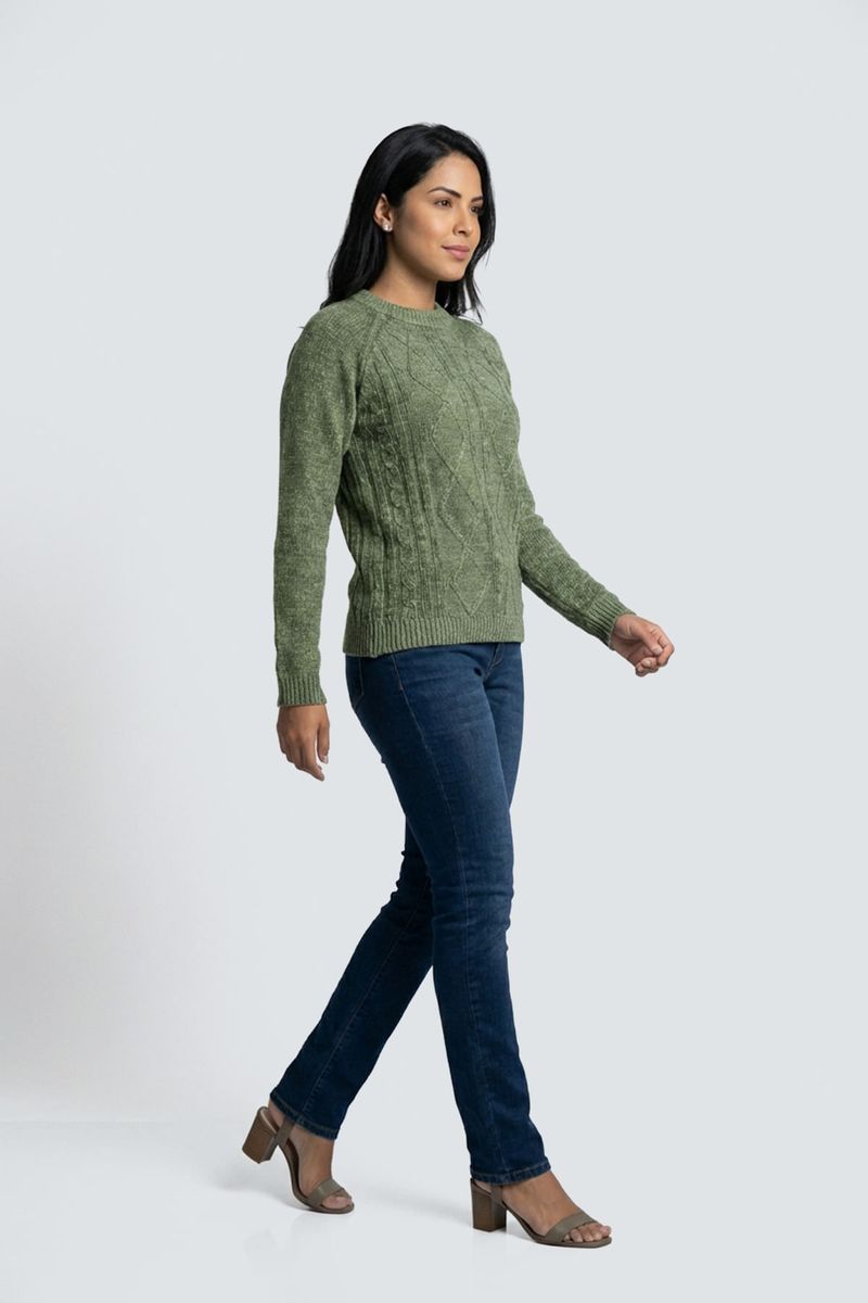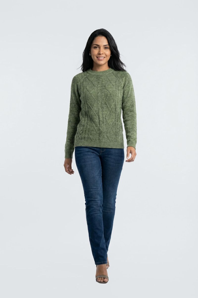 Suéter Feminino Chenille Verde Oliva Aconchegante com Tranças Caedu. Em 100% poliéster, sua cor verde oliva (pistache) e o design trançado com gola redonda oferecem um visual sofisticado e aconchegante.