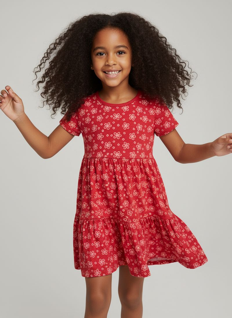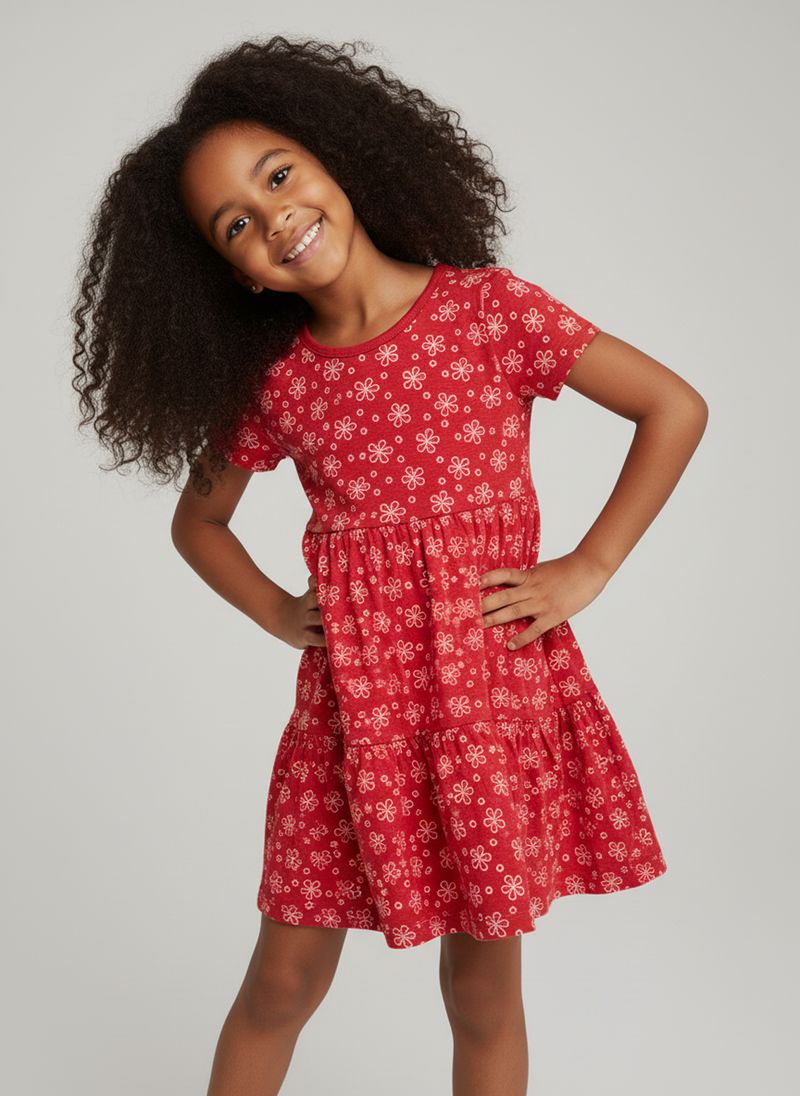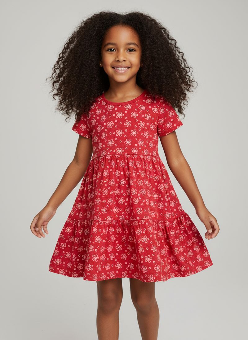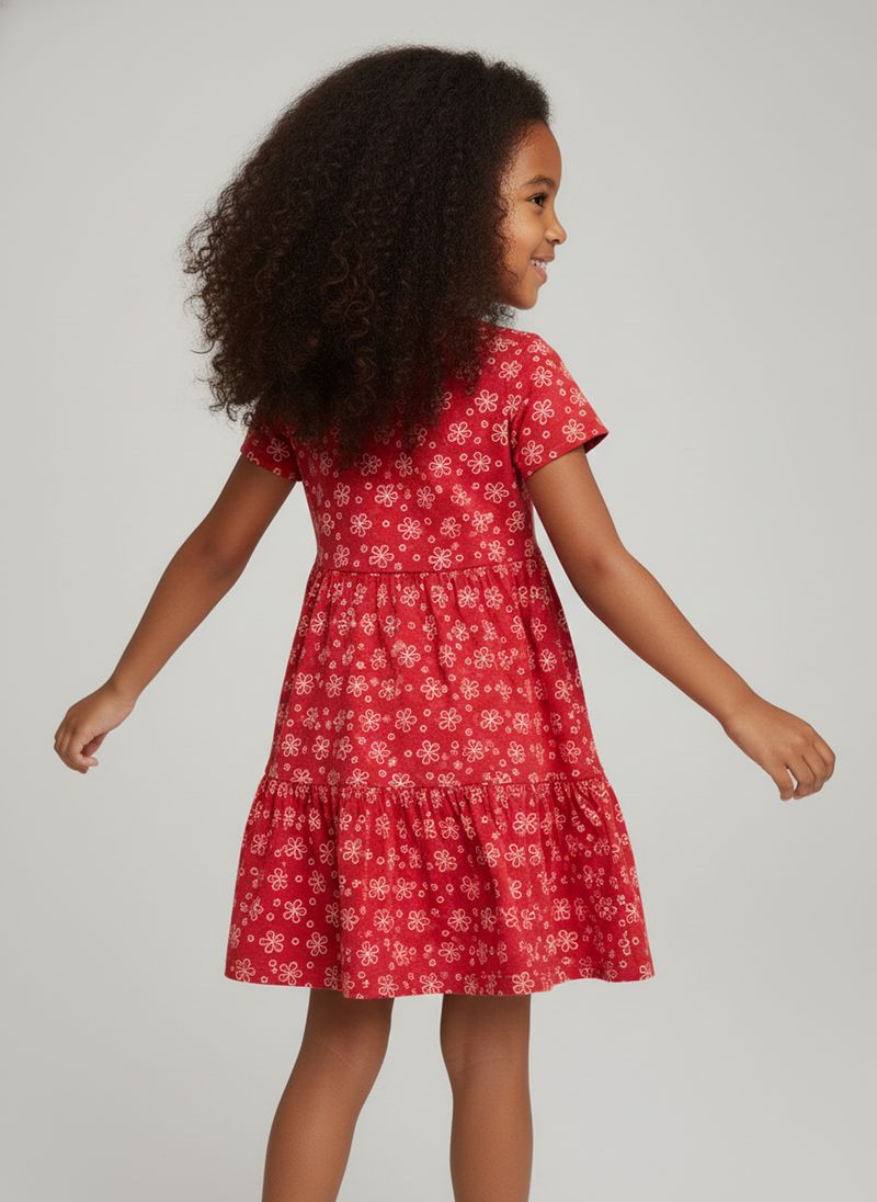 O Vestido Infantil Vermelho Estampado com Flores e Babados Caedu é perfeito. Em meia malha, oferece conforto e leveza. Com estampa floral e babados, garante um visual charmoso e casual para sua pequena. Roupa Caedu.