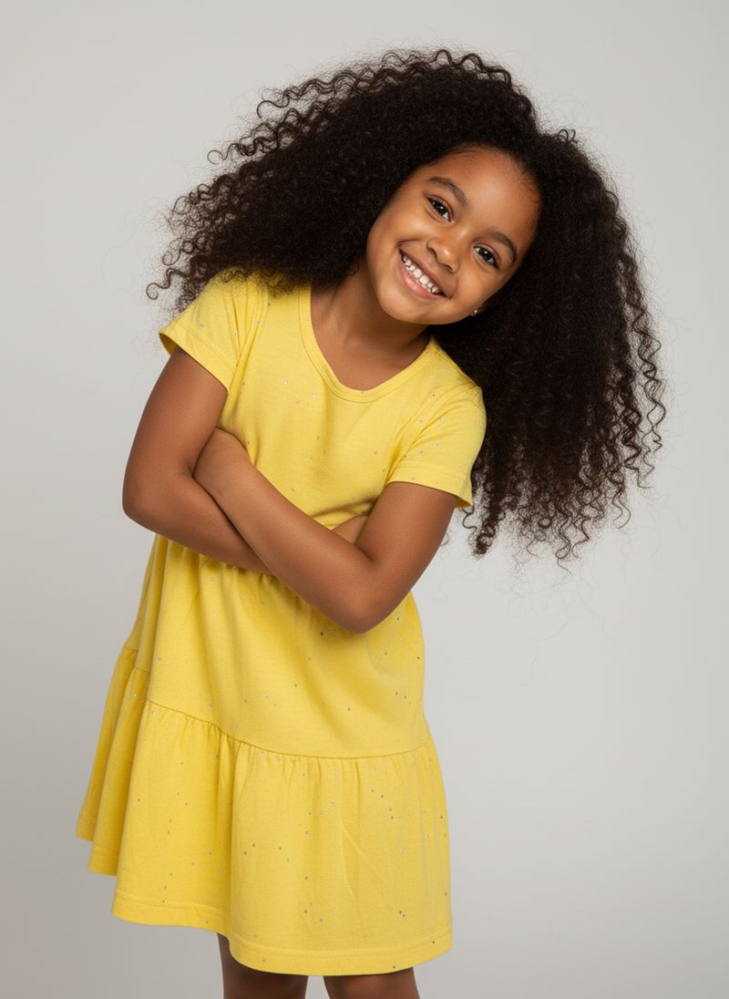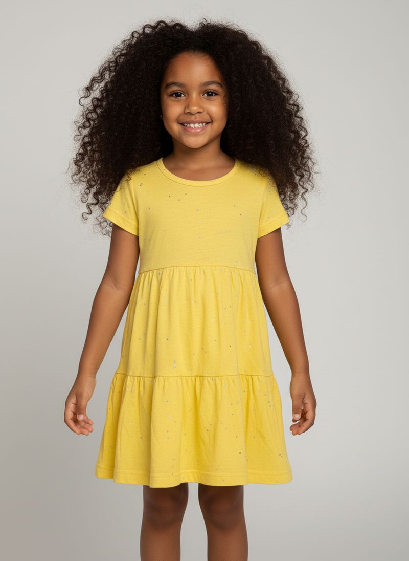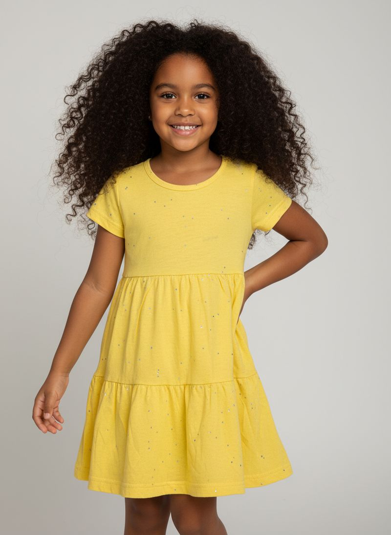 Deixe sua pequena brilhar com o Vestido Infantil Amarelo Sol com Glitter e Babados Caedu. Confeccionado em meia malha, este vestido amarelo claro oferece conforto e um caimento solto. Com seu design vibrante, detalhes de glitter e saia de babados, é a escolha perfeita para um look encantador e cheio de estilo. Uma roupa infantil que inspira alegria!