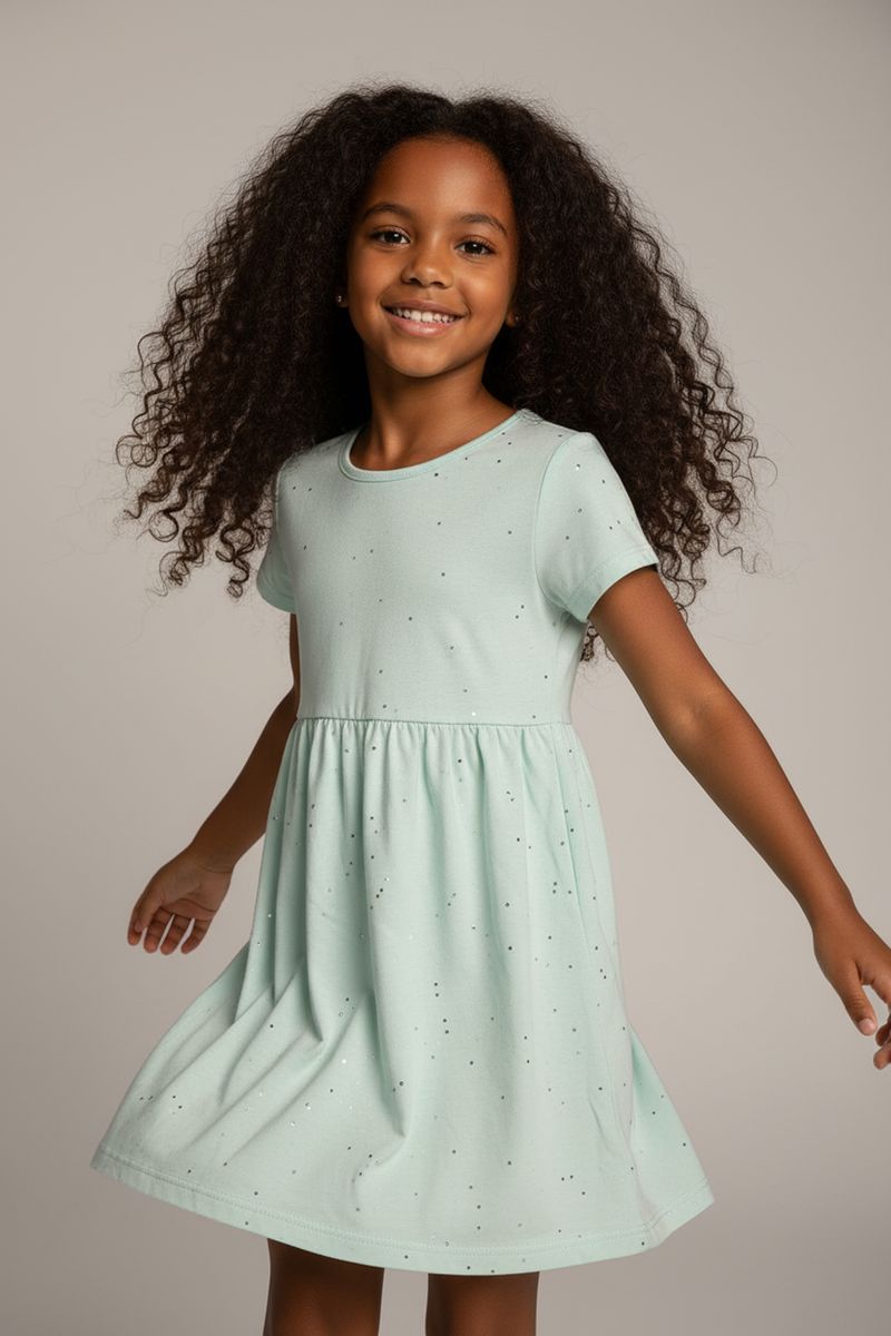 O Vestido Infantil Verde Menta com Glitter e Saia de Babados da marca Infantil é a escolha perfeita para um look encantador. Confeccionado em meia malha, oferece conforto e um caimento fluido. Seu brilho sutil e a saia de babados garantem um visual mágico para as pequenas, ideal para quem busca roupa infantil com estilo.