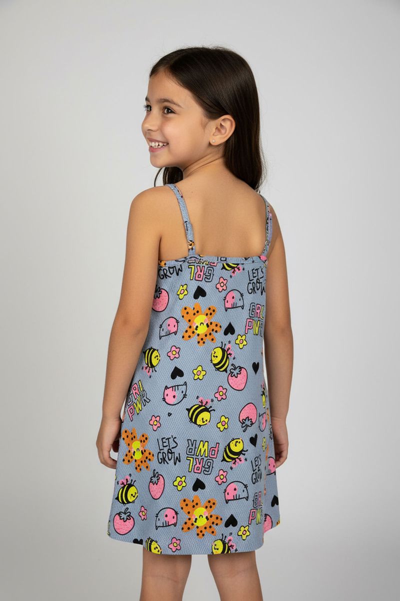 meia malha oferece conforto e leveza, com caimento solto e evasê. Sua estampa vibrante de abelhas, morangos e frases como 'GRL PWR' torna-o a