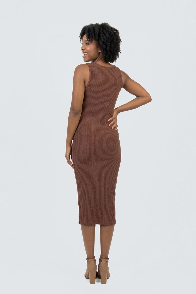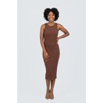Eleve seu estilo com o Vestido Midi Canelado Feminino Marrom Chocolate Caedu. Tom terroso, ícone da moda, oferece elegância e versatilidade. Design sem mangas, canelado e silhueta justa garantem sofisticação e conforto, ideal para quem busca praticidade e estilo em uma única peça. Combine com acessórios e arrase!