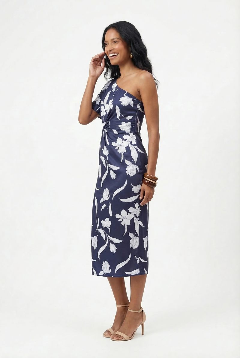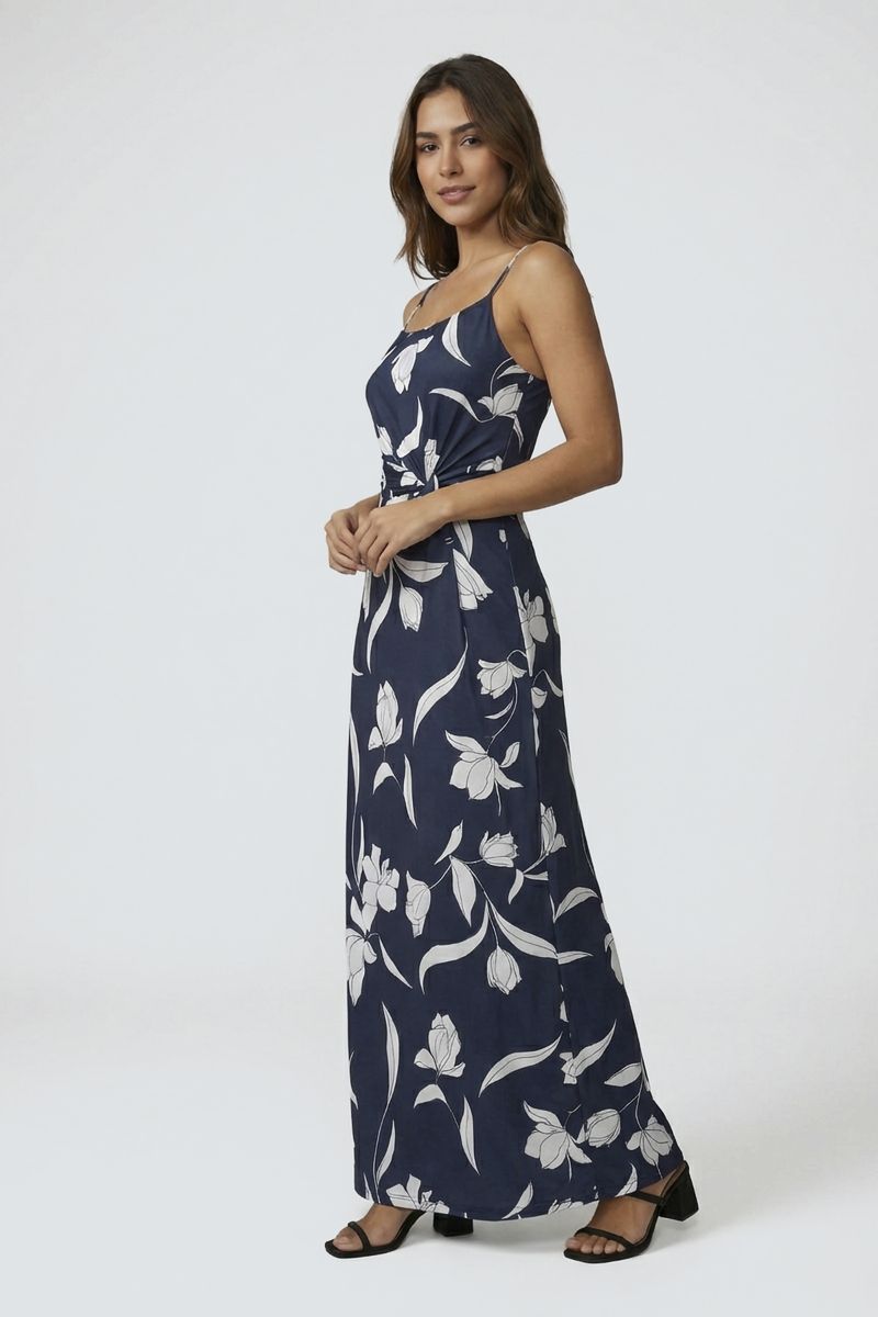 Deslumbre-se com o Vestido Longo Floral Azul Marinho Caedu. Sua estampa delicada e alças finas realçam a feminilidade, enquanto a amarração na cintura proporciona um caimento acinturado e confortável. Perfeito para quem busca um visual elegante e leve na moda feminina.