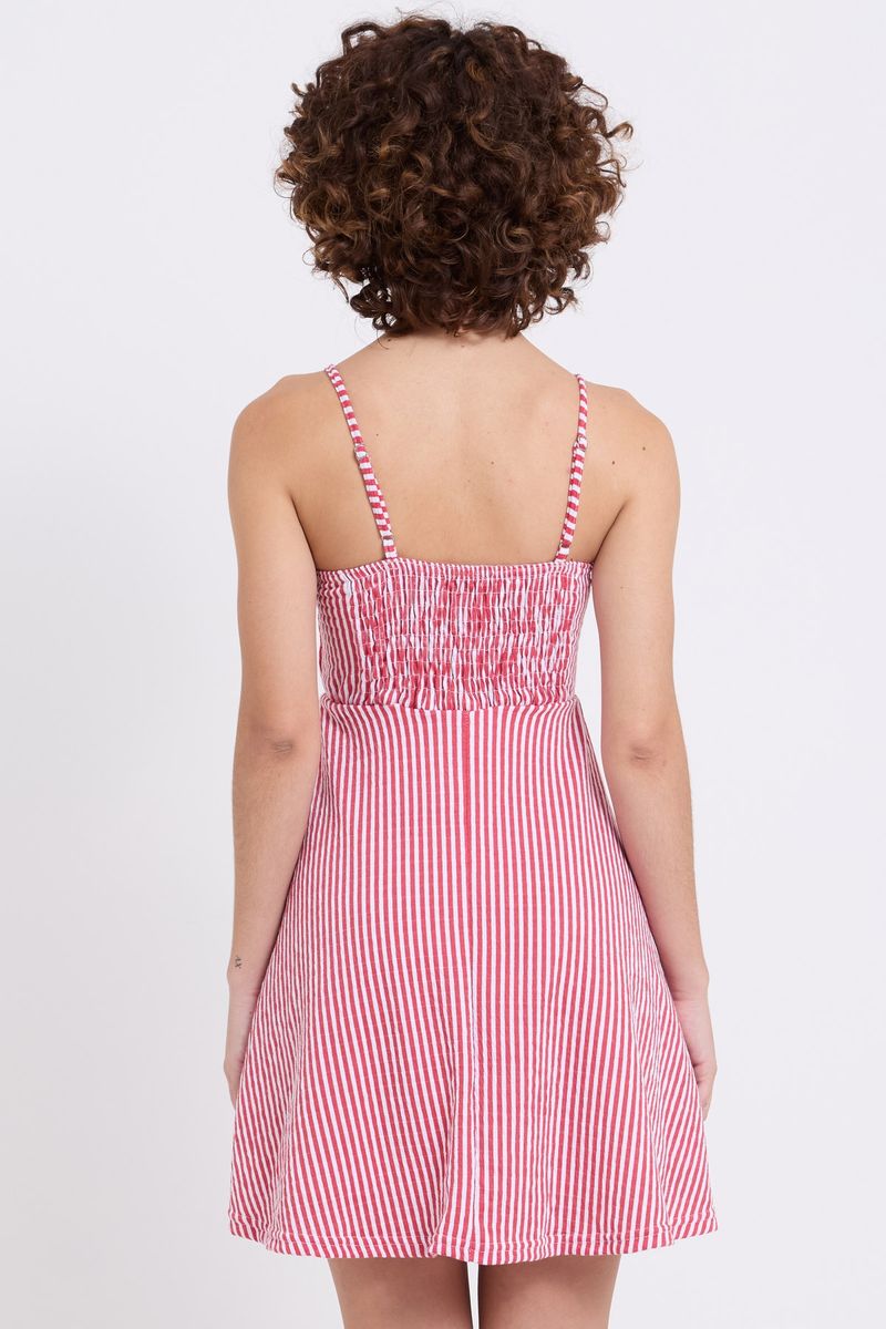 Combine o Vestido Curto Listrado com sandálias rasteiras ou tênis brancos para um look casual e despojado. Para um toque mais sofisticado, adicione uma jaqueta jeans leve e acessórios discretos. Bolsas de palha ou crossbody complementam o visual com charme e praticidade, ideal para o dia a dia.